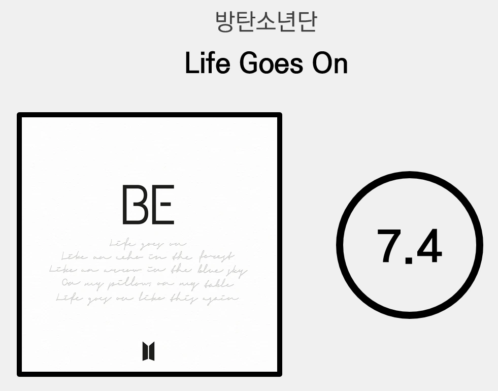 언제부터인가 방탄소년단(BTS)은 너무나도 큰 존재가 되어 버렸다. 그러나 두 발을 딛고 선 위치는 변해도 음악을 대하는 그들의 태도는 언제나처럼 진솔하다. 데뷔 초반의 'Miss Right'을 닮은 멜로우한 무드의 힙합 비트에 '봄날'의 서정성을 얹은 'Life Goes On'은 우리가 사랑했던, 사랑하는, 사랑할 방탄소년단의 순간들이 파노라마처럼 담겨 있는 한 장의 흑백 사진 같은 트랙이다. 치명적인 전염병에 전세계가 마비되고 중소 기획사의 연습생들이 세계적인 스타가 되는 거짓말 같은 일들이 일어나더라도 여전히 아무 일도 없었다는 듯 또다른 하루가 돌아오겠지만, 방탄소년단의 음악과 함께라면 '미래로 달아날' 수 있을 것만 같은 기분이 든다.