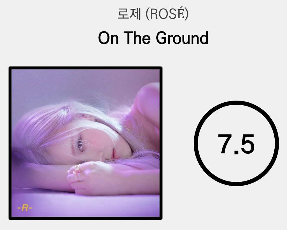이 철학적인 사유 과정은 엘리 굴딩(Ellie Goulding) 풍의 뭉툭한 신디사이저 비트가 점점 고조되며 절정에 치닫는 곡의 구조를 통해 묘사된다. 그 안에서 능숙하게 곡을 이끄는 로제의 솜씨는 그녀의 보컬이 더 이상 아이돌이라는 범주에 가두기 어려울 정도로 무르익었음을 여실히 보여 준다. 이처럼 'On The Ground'는 인간으로서의 로제와 보컬리스트로서의 로제 모두의 성숙을 성공적으로 증명해 낸 우수한 싱글이다.멋진 솔로 아티스트가 된 그녀의 향후 행보에 진심어린 응원을 보낸다.
