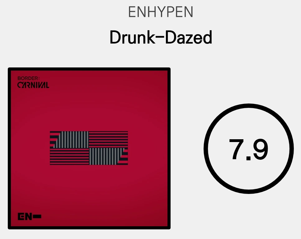 이 카니발 속에서 취하고(Drunk) 몽롱해진(Dazed) 엔하이픈의 모습은 무엇보다도 완성도 있는 음악을 통해 효과적으로 표현된다. 사이키델릭 록에 가까운 둔탁하고 강렬한 비트와 공격적인 베이스 위를 내달리며 거칠게 변조되는 멤버들의 보컬이 청각을 날카롭게 자극하는 프로덕션에서 뱀파이어들이 벌이는 환락의 파티를 자연스럽게 상상할 수 있다. 이 압도적인 퀄리티의 사운드는 청자로 하여금 '붉은빛 송곳니', '심장을 태워' 등 과격하고 컨셉츄얼한 노랫말에 효과적으로 몰입하게끔 만든다. 식인(食人)을 뜻하는 '카니발리즘(Cannibalism)'을 연상시키는 카니발(Carnival)을 벌이고 있는 일곱 명의 뱀파이어의 다음 이야기는 무엇일까. 당신이 아이랜드(I-LAND)를 보지 않았더라도, 혹은 멤버들 개개인에 대해 잘 모르더라도 탄탄한 음악 자체만으로 그들의 서사에 귀기울이게 되는 마력을 지닌, 말 그대로의 '괴물' 신인이 등장했다. 그 무시무시한 뱀파이어의 이름은 바로 엔하이픈(ENHYPEN)이다.