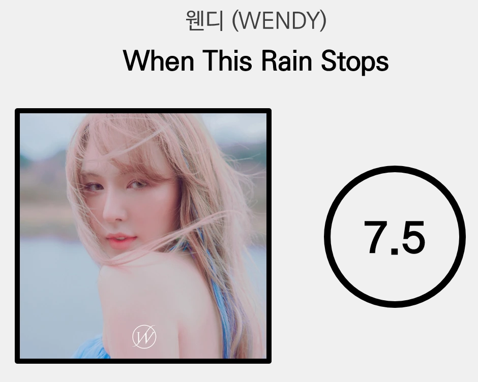 반복되는 'When This Rain Stops'라는 가사가 'Wendy's Rain Stops'로 들리는 건 기분 탓일까. 끝나지 않을 것만 같던 그녀의 오랜 장마는 결국 그쳤고 무지갯빛 노래와 함께 웬디는 돌아왔다. 이제 그녀는 세상 가장 큰 우산이 되어 비에 젖은 이들을 다시 따스하게 감싸 주려 한다.