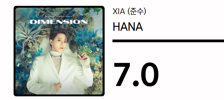 김준수(XIA)의 세 번째 미니앨범 타이틀곡 'HANA'는 기본적으로 뭄바톤 장르의 형식을 취하고 있지만, 신비로운 질감의 피치카토 스트링과 대금의 투입으로 색다른 감흥을 선사한다. 오랜 경력을 증명하듯 노련함을 뽐내는 김준수의 보컬은 노래에 강력한 호소력을 부여한다. 백전노장이 영리하게 매너리즘을 피해 가는 방법을 보여 주는 수작.