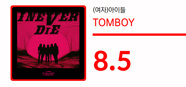 두말할 것도 없이, 'TOMBOY'는 좋은 음악이라는 점을 다시 한 번 강조해야겠다. 에너지를 가득 품은 로킹한 기타가 속도감 넘치게 질주하는 비트는 짜릿한 액션 영화처럼 생생하게 맥동하고, 전소연의 감각적인 멜로디메이킹 실력 역시 여전히 빛난다. 군더더기 없이 깔끔한 구성은 곡의 흡인력을 더욱 강화한다.