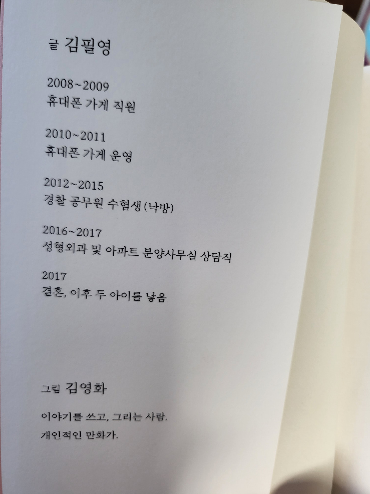 나는 너무 좋았지만 이발소를 하는 부모님께서는 손님들이 책날개를 보고 표정이 바뀌거나 비아냥 거리기도 했다면서 (한심하다는 눈빛 첨가) 속상해하셨다. 난 요즘 이런 게 유행이라며 계속 둘러댔다. 이렇게 저자 소개를 쓰는 과정이 험란했지만 이 책의 저자소개를 쓰고 난 다음부터는 내가 나를 소개하는 일이 정말 쉬워졌다.