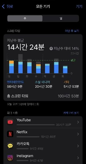 전자기기를 얼마나 사용했는지 알려주는 스크린 타임을 보니 지난주에만 평균 열네 시간을 사용했더라구요. 일주일 다 합해서가 아닌 하루에 열네 시간 말이에요. 많은 시간으로 보이긴 하지만 비교 대상이 없으니 많은 시간인지 체감이 잘 되지는 않습니다.