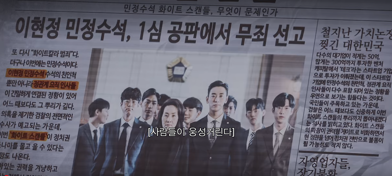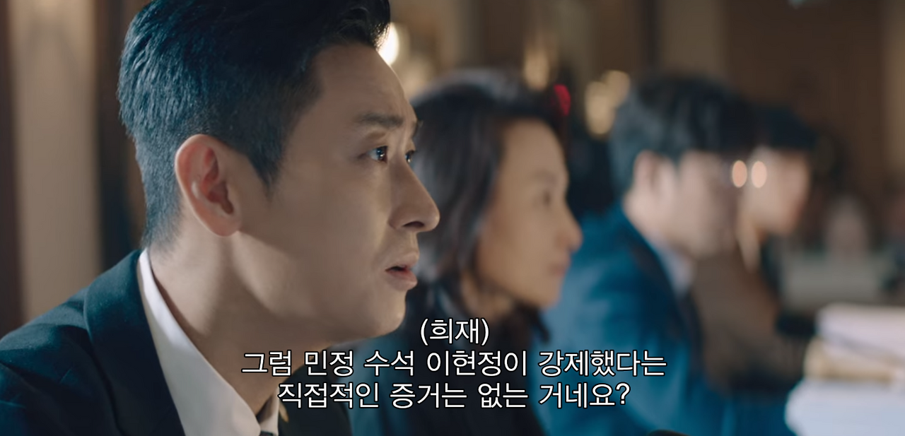 그러니까 검사를 향해 "그럼 민정수석 이현정이 강제했다는 직접적인 증거는 없는 거네요?" 라고 몰아붙이는 건 드라마 버전, 판사를 향해 "검찰이 제출한 증거 어디에도 민정수석 이현정이 강제했다는 직접적인 증거는 없습니다." 라고 말하는 건 실제버전이다.