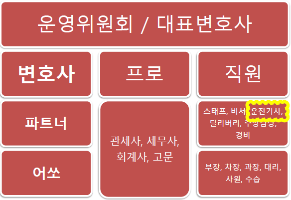 여느 기업 조직이 인사팀, 총무팀, 기획팀 ... 이렇게 나누어져 있는 것처럼, 로펌에도 인사팀, 총무팀, 대외팀... 과 같은 여러 부서가 있다. 그 중 하나가 운전기사들로 구성된 팀이다.