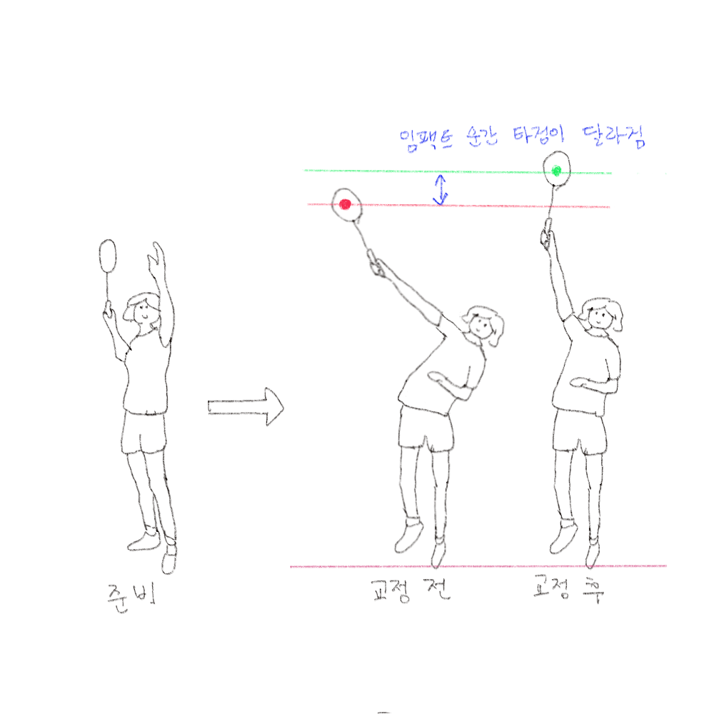 딸아이는 공이 낮고 짧아서 고민이었는데 레슨을 통해 잘못된 자세를 알게 되었다. 교정 전에는 상체가 무리하게 옆으로 틀어지면서 스윙이 옆으로 나가 공의 타점 자체도 낮고 힘이 분산되었다. 교정하기 위해서는 상체를 무리하게 비틀지 않고 위로 스윙 하여 높은 타점에서 셔틀콕을 쳐야 한다.