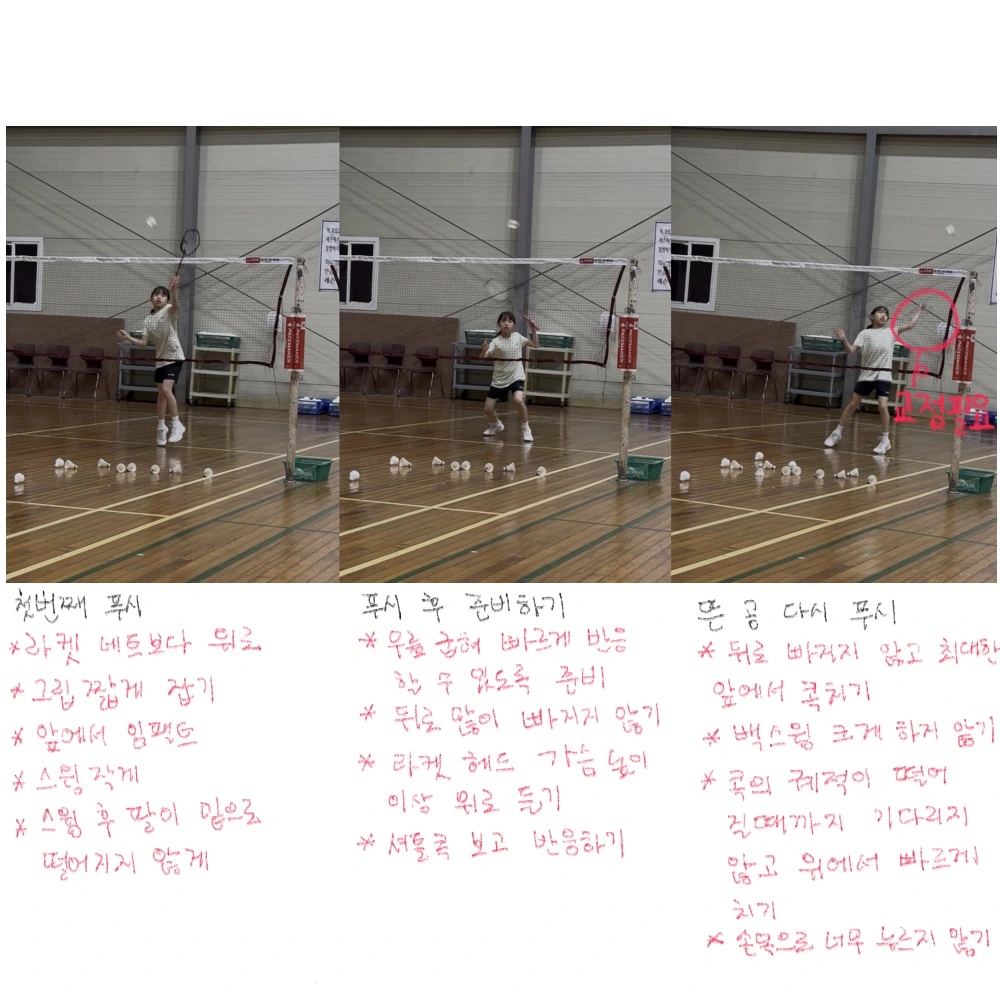 딸아이는 첫 번째 푸시 후 준비까지는 좋았는데 뜬 공을 다시 푸시하는 과정에서 스텝의 방향이 대각선 뒤로 움직여 콕의 궤적이 떨어질 때 임팩트하여 네트에 걸리는 경우가 많았다. 또한, 스윙 시에 백스윙 동작이 커서 콕을 몸 앞에서 잡지 못하게 되고 결과적으로 임팩트 시 정확한 힘전달이 안되고 콕이 직선으로 나가지 못하고 밀려 맞았다.