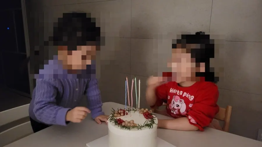 후배가 준 케이크를 먹는 두 딸