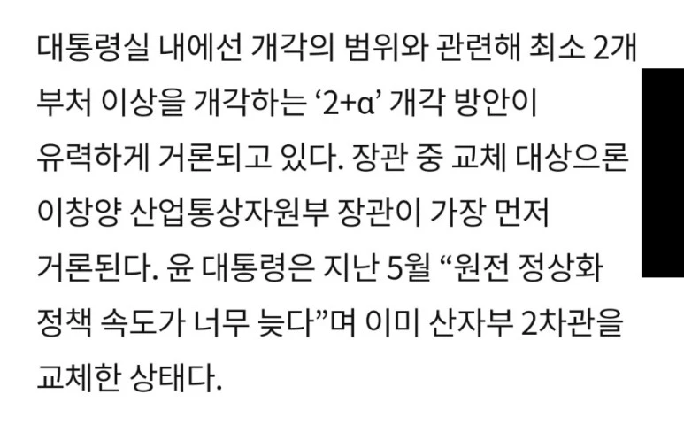 작년 7월 뉴스라 좀 시간이 지난 내용이긴 하지만, '원전 정상화 정책 속도가 너무 늦다'라고 윤 대통령이 말하면서 산업통상 자원부 장관 교체를 언급하고 있습니다.
