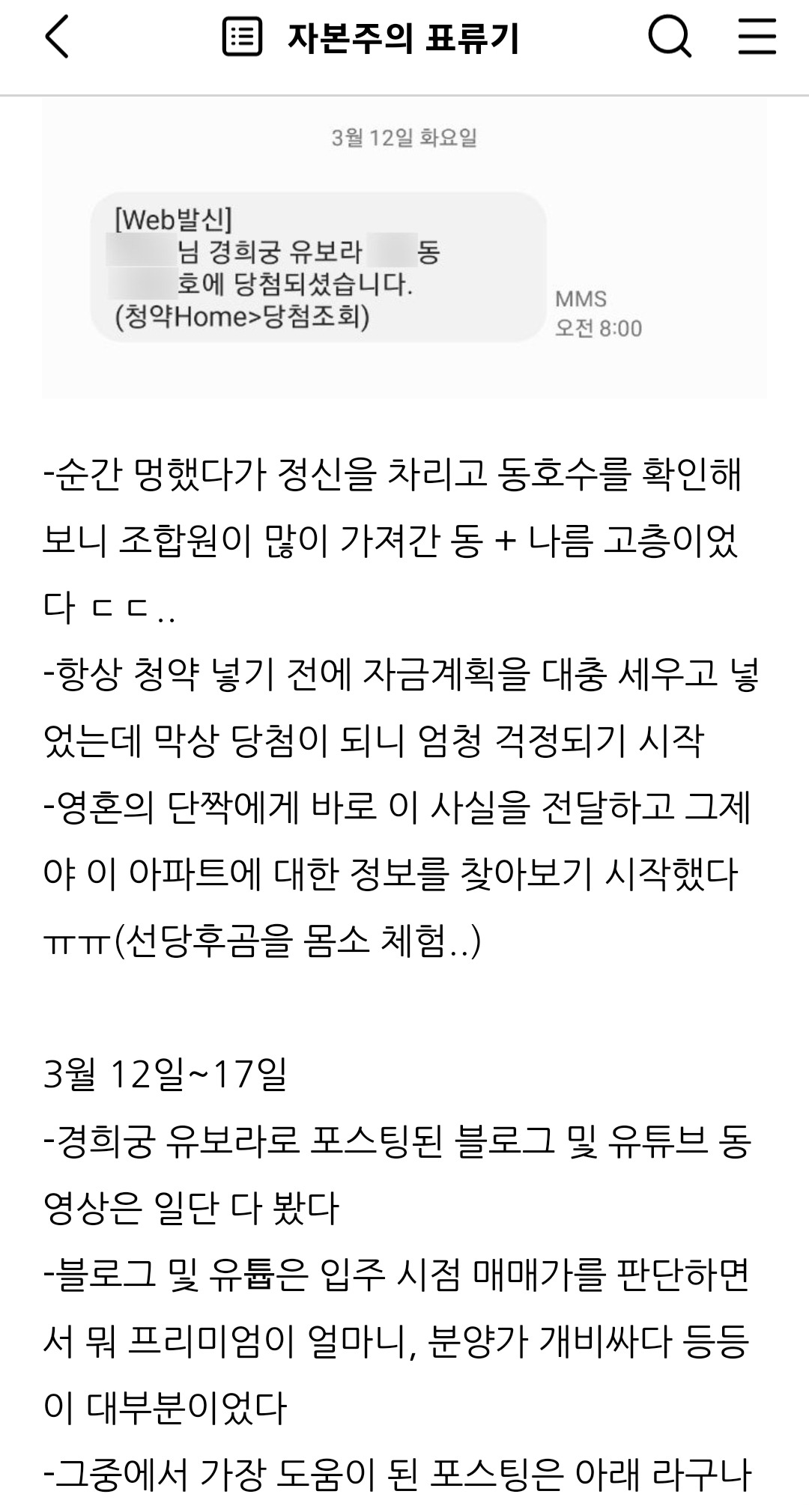 저는 전혀 몰랐는데 '경희궁 유보라' 청약에 당첨되신 분이셨습니다.