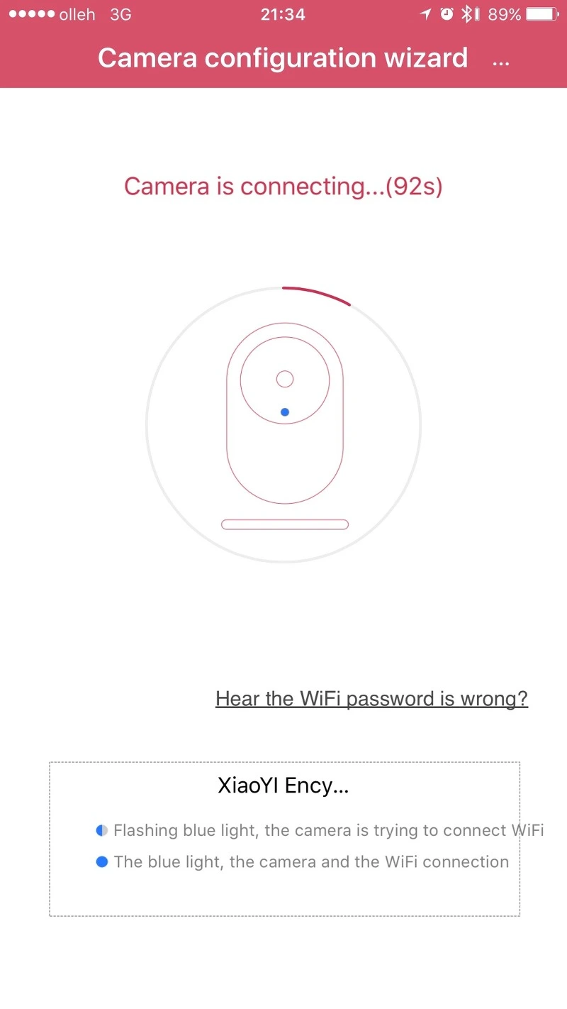 세팅 상태로 들어간다음 WiFi 비번을 입력을 하고, 카메라에 전원을 넣으면 카메라 전면부 LED 등이 노란색으로 보입니다. 이때 휴대폰의 음량이 중간 정도로 조절됩니다. 그리고 카메라에서 어쩌고 저쩌고...라고 중국어로 말을 합니다.