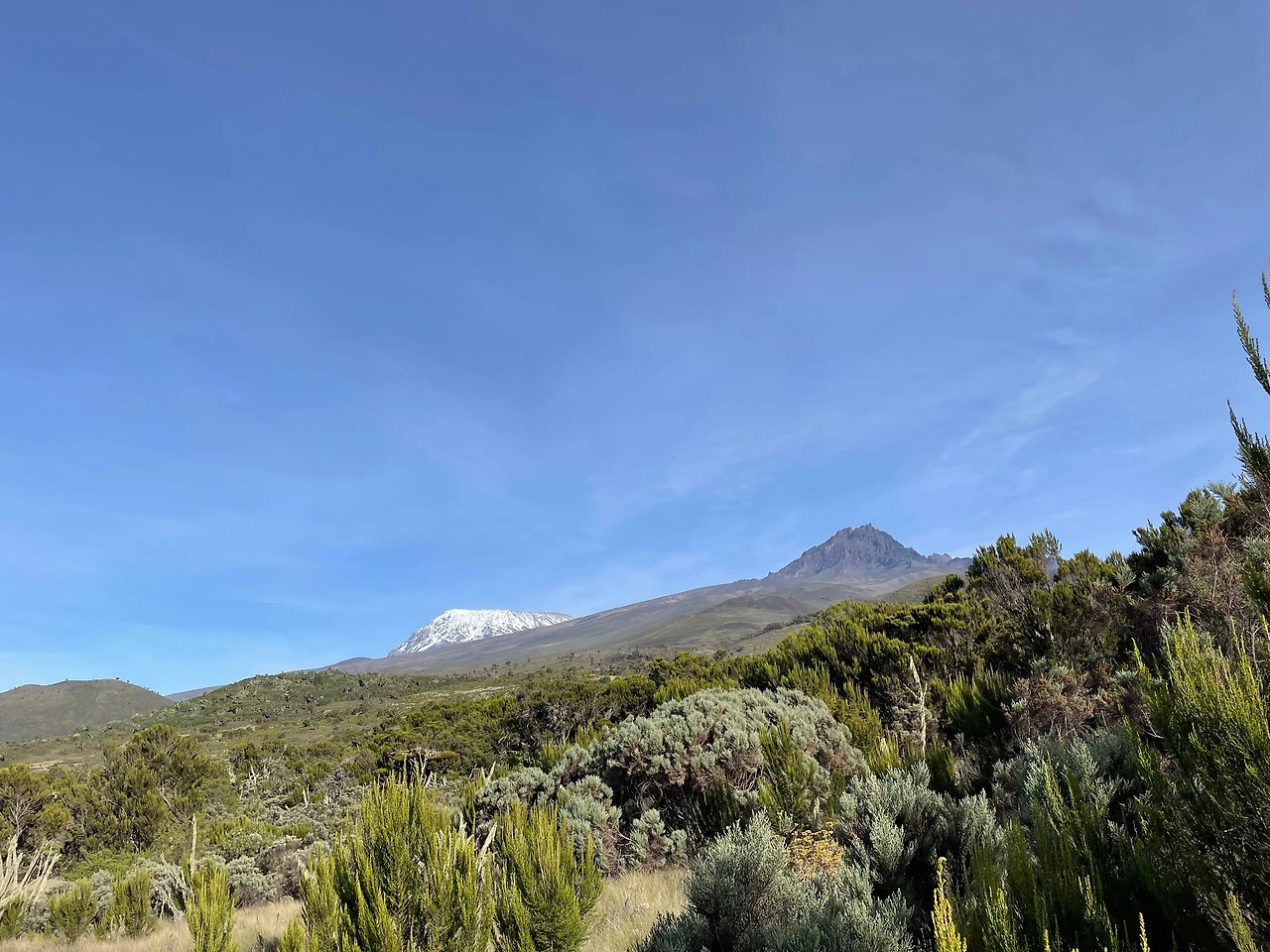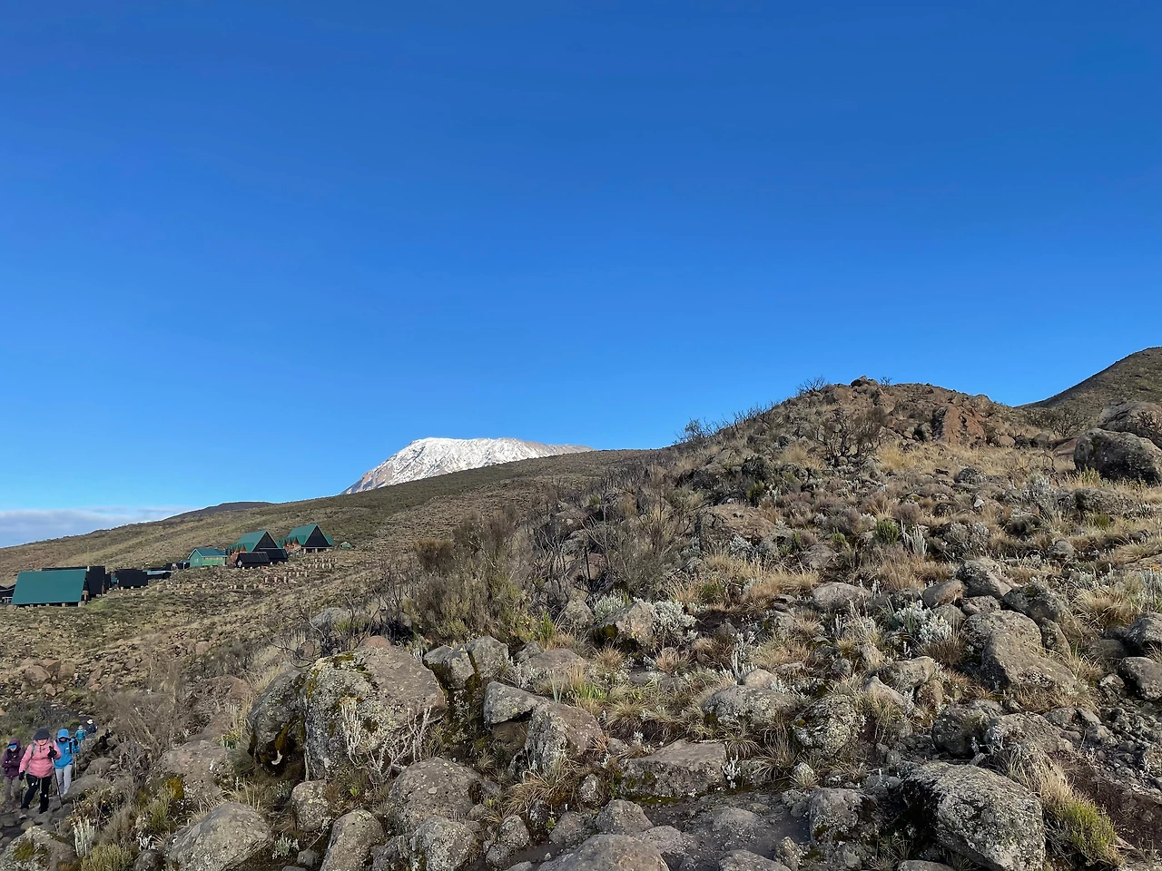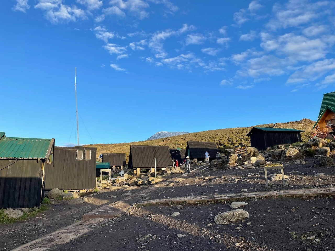 1시간 20분이 지나고 나니 벌써 도착했다. 사진 한방을 찍고 우리들은 다시 숙소로 돌아왔다. 호롬보 산장 뒤로 저 멀리 킬리만자로 산이 보인다. 어제는 눈이 많이 녹아서 걱정이었는데, 다시 눈이 쌓여있다.