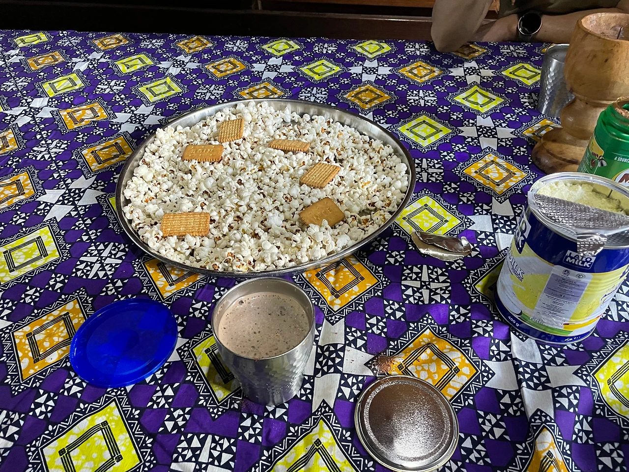 키가 큰 나무 숲을 걷고 걸어서 오후 4시 40분쯤에 만다라 산장에 도착을 했다. 도착을 하면 킬리만자로 맛집 메뉴인 팝콘을 준다. "정말 이 집 팝콘 잘한다."