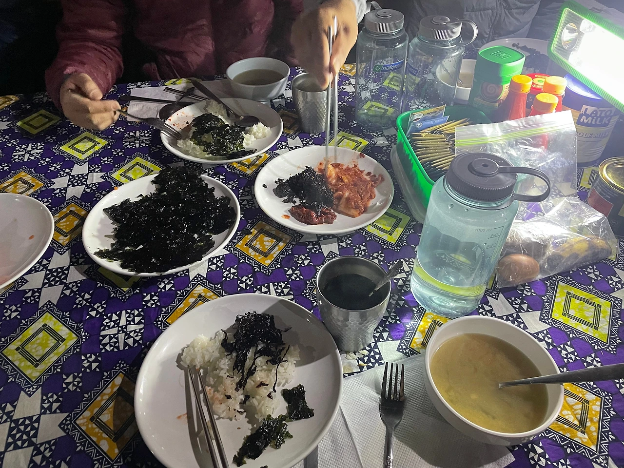 오후 4시에 저녁으로 떡국을 빠르게 먹고 10시 30분까지 휴식을 취한다. 산행을 위해서 잠에 들어야 하는데 잠에 들지 못해서 뜬눈으로 밤을 세운느낌이다. 저녁 10시 30분에 간단하게 수프, 누룽지 등을 먹고 바로 등반준비를 한다.