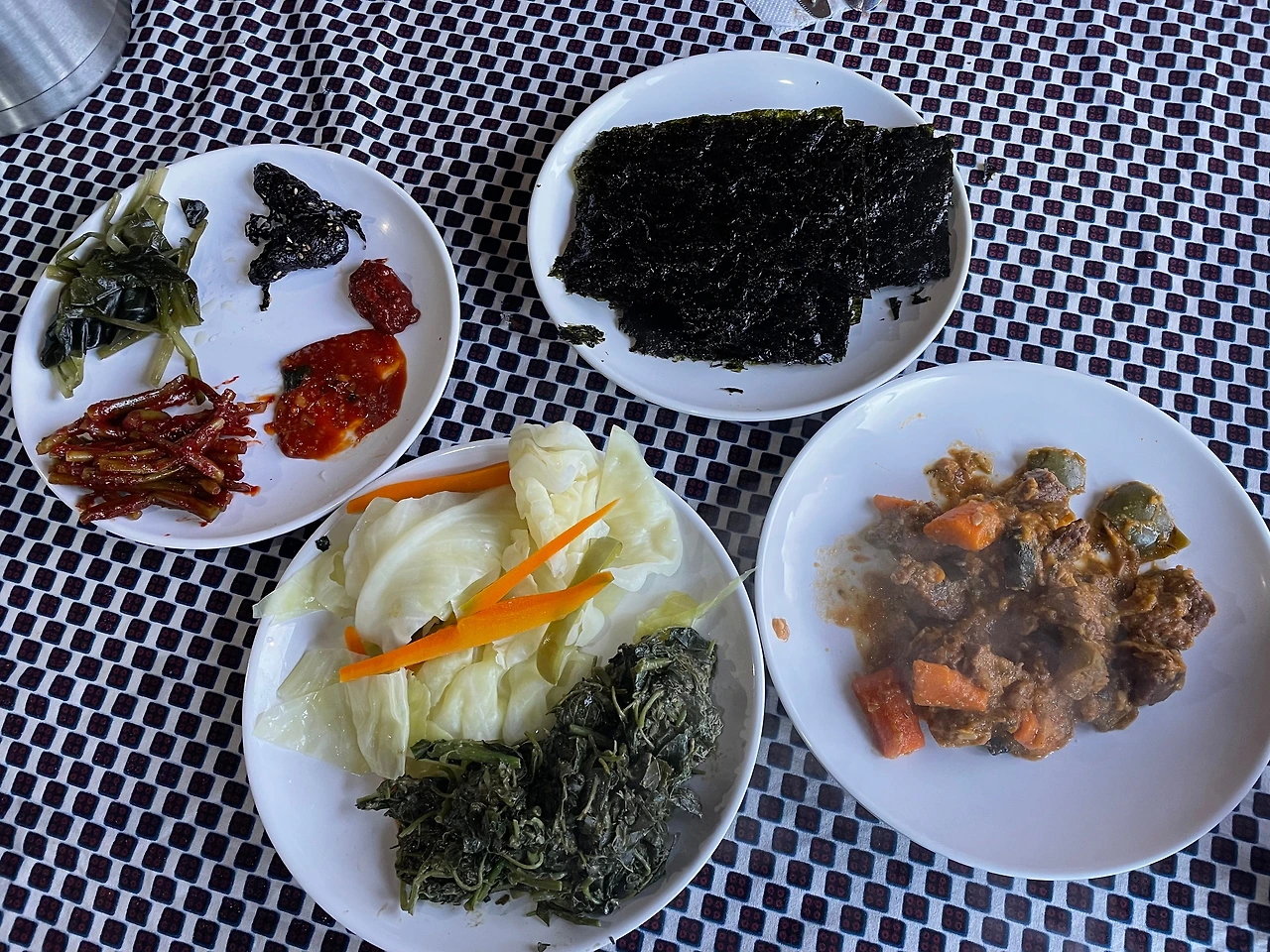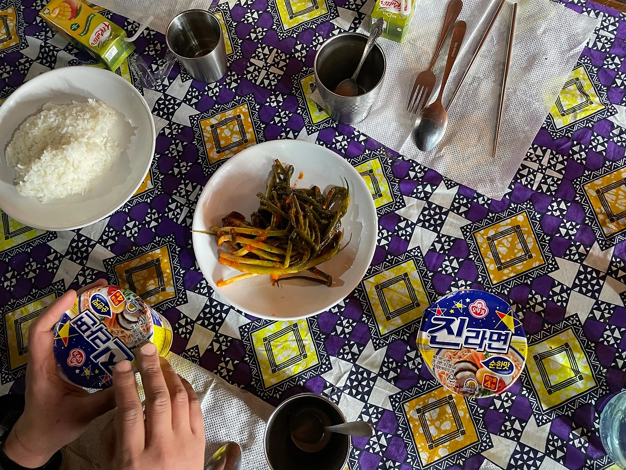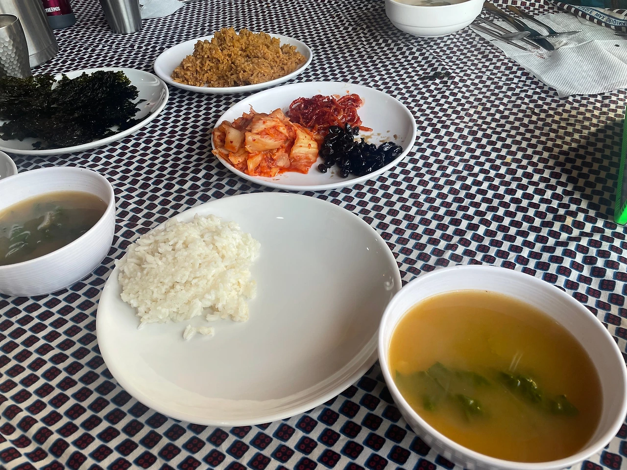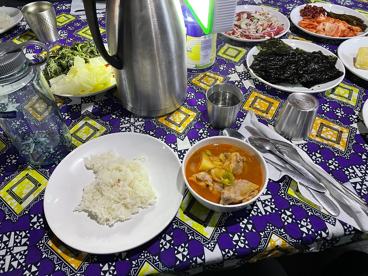 7시 30분 산행 시작을 위해 5시 30분에 일어난다. 그리고 6시 30분에 한식 밑반찬과 된장국으로 아침을 먹는다.