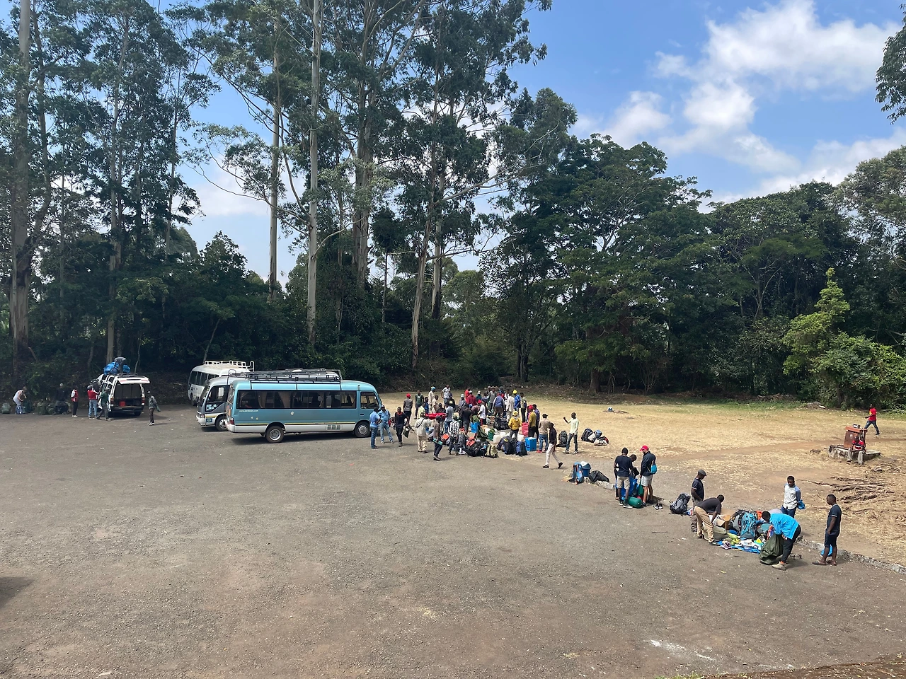 1시간 10분을 달려 차에서 내리면 50여 명의 포터가 우리의 짐을 날라준다. 입산 심사가 진행될 동안 점심 도시락을 받고 떠날 준비를 한다.