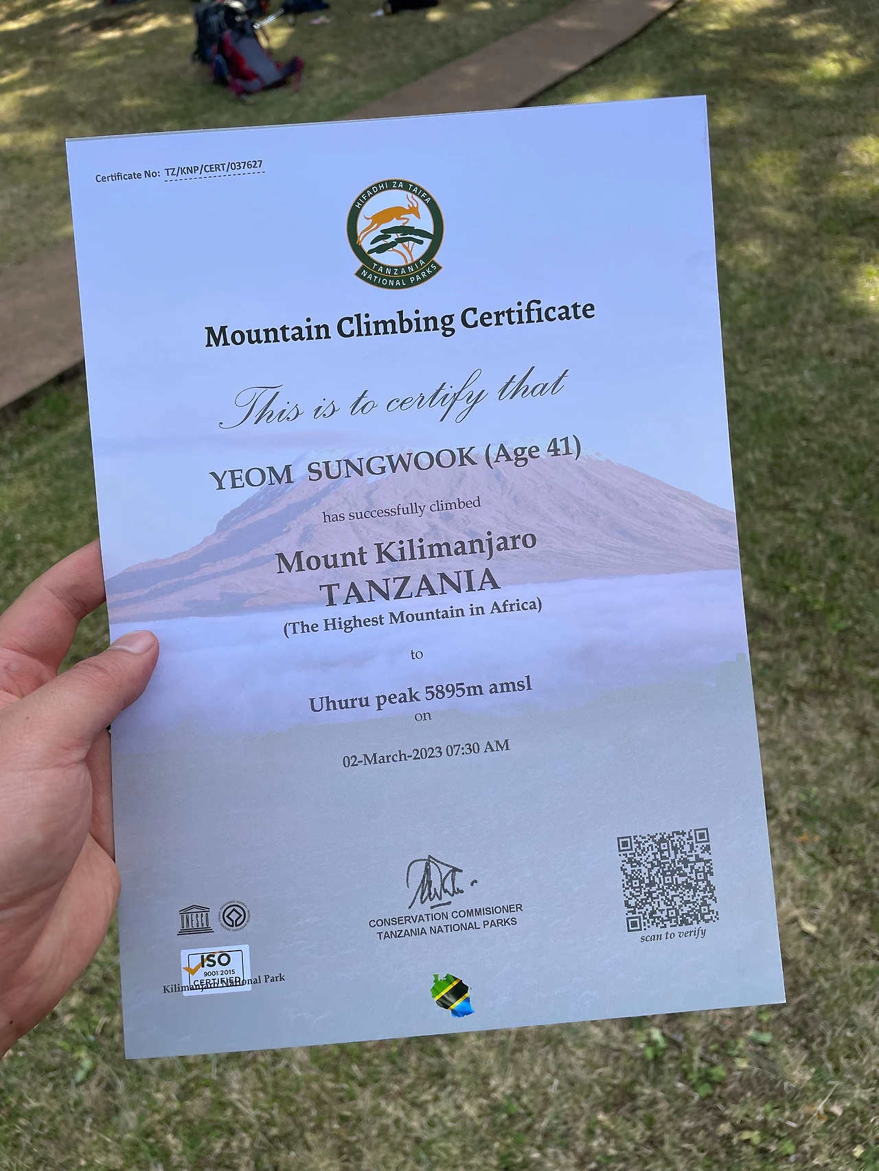 그리고 정상 등반 인증서를 받았다. 마지막 축하의 노래... 하쿠나 마타타.