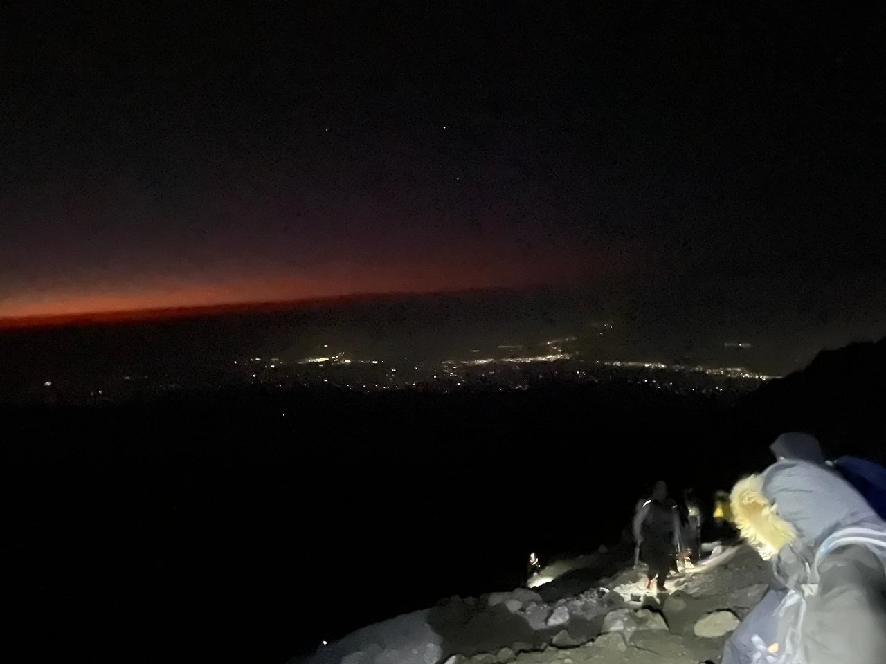휴식시간에 콜라를 마시기 위해 뚜껑을 땄더니 슬러시가 되어 있었고, 땀에 젖은 장갑은 얼어가고 있어서 더 추웠다. 빨리 올라가고 싶지만, 위험하기에 다들 천천히 폴레폴레 걷는다. 걷다 보니 저 아래 도시 불빛도 보인다.