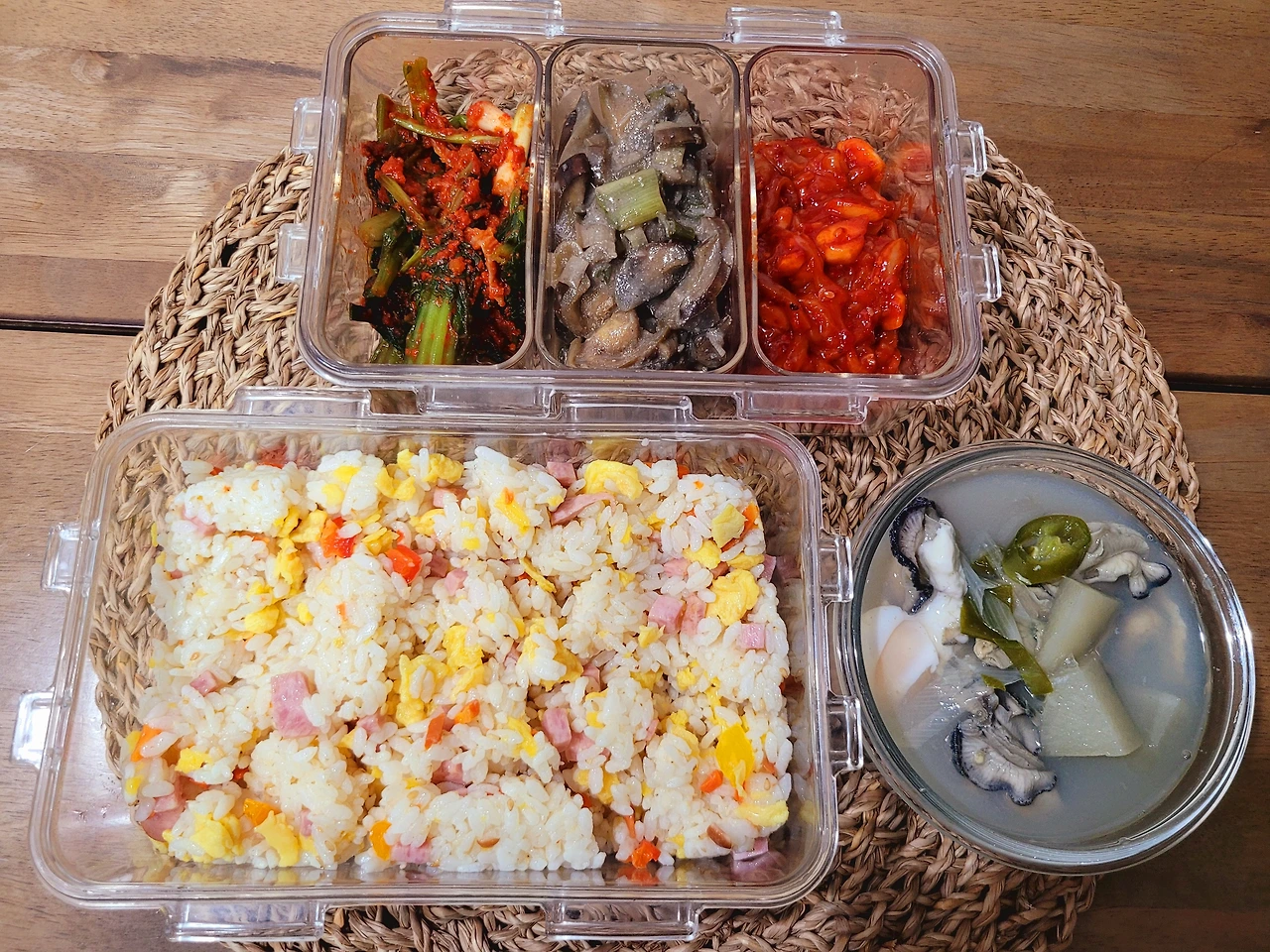 햄계란볶음밥, 굴국, 오징어젓갈, 들깨가지볶음, 그리고 갓김치.