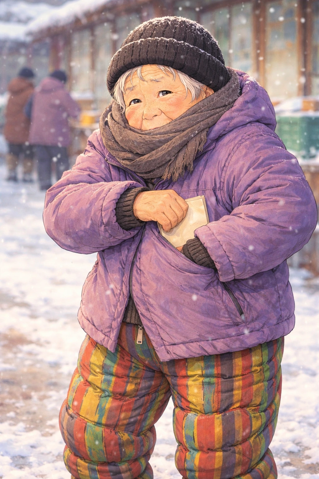 보라색 모자를 푹 눌러쓴 작은 체구.