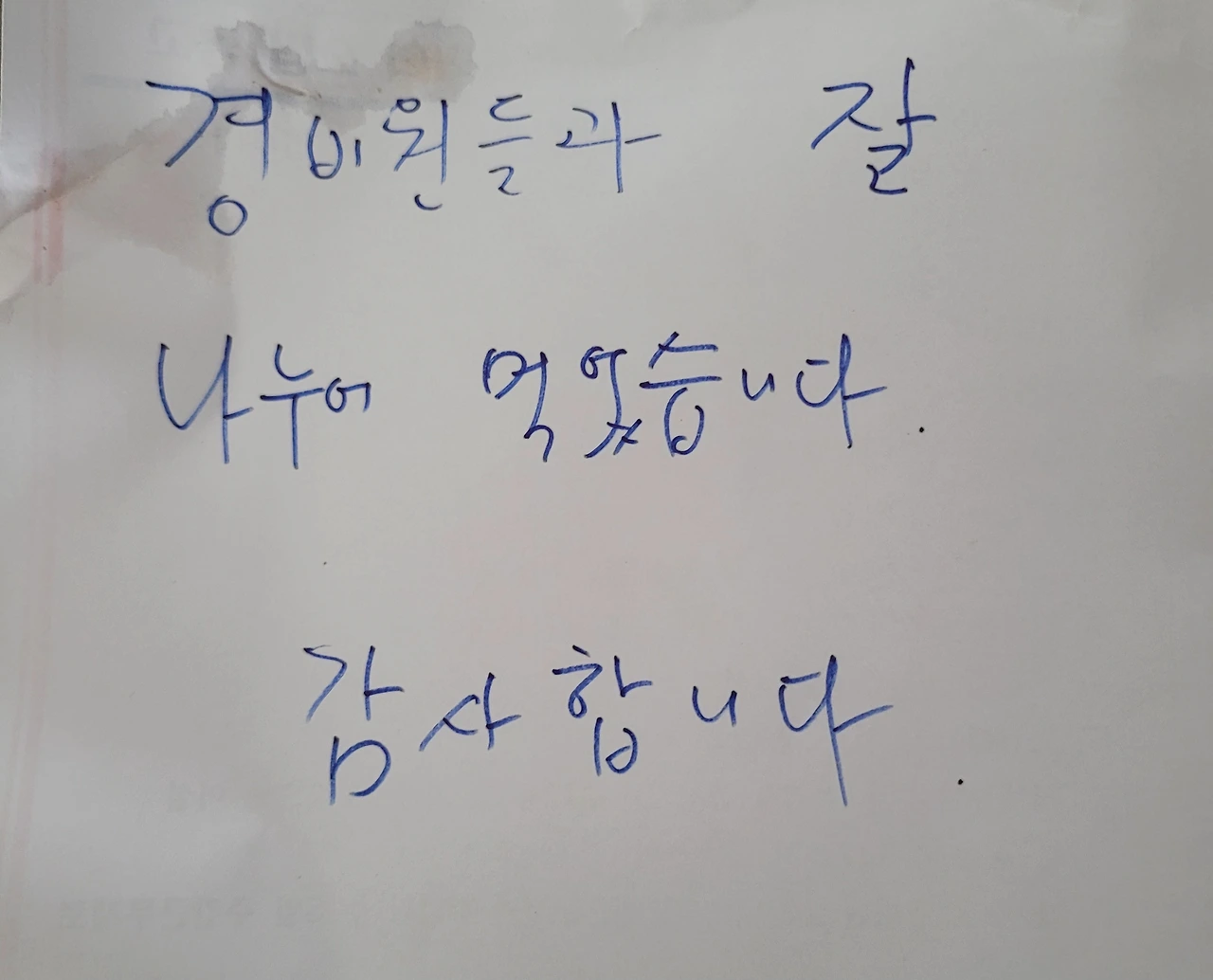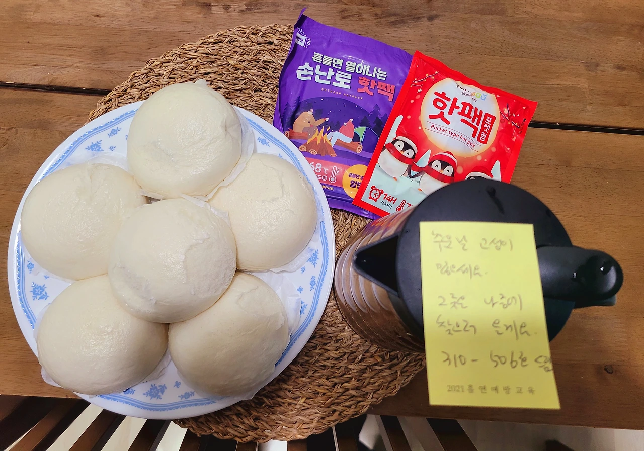 호빵과 보온병을 건네자 경비원분이 환하게 웃으며 고맙다고 하신다.