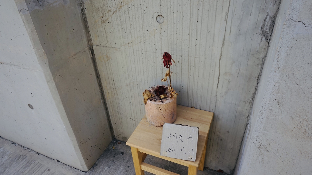폐연탄을 활용한 작품인데, 시멘트 벽 느낌과 묘하게 어울린다.