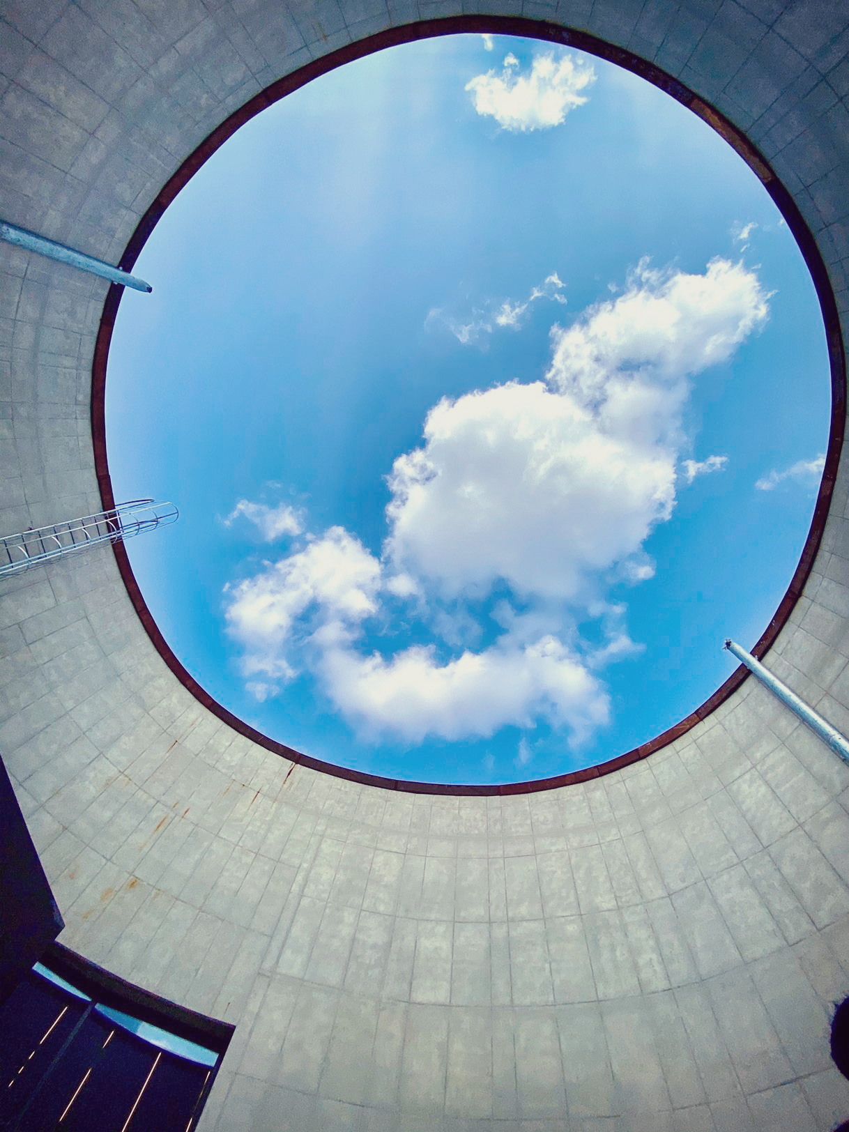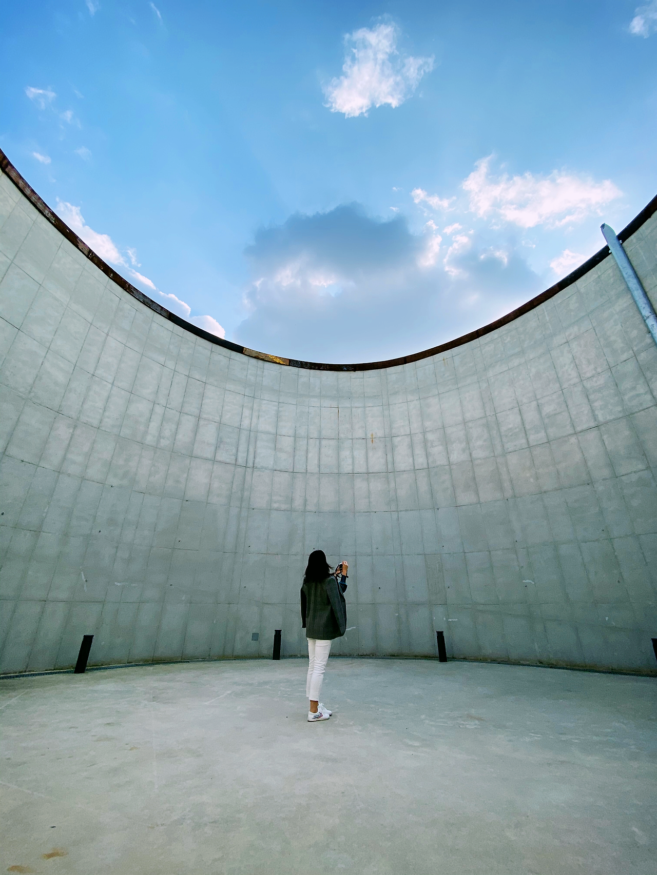 문화비축기지 건물 내에 마련된 사진 스팟. 전체적으로 둥근 공간이라 하늘을 바라보면 묘한 느낌이 든다. 다양한 구도로 사진이 잘 나오지만, 가운데 서서 찍는 게 가장 잘 나오는 듯하다.