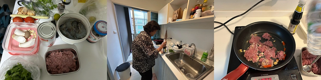 붐에게 태국요리를 배우고 싶다고 하니 자기 어머니한테 배우란다. 우리는 서로의 어머니들에 대해서도 가끔씩 이야기를 주고받았고 힘듦에 대해서도 공감이 있었기에 그 제안에 거부감은 없었다. 요리는 우리 주방에서 하시겠다고 하셔서 콘도로 오셨다.