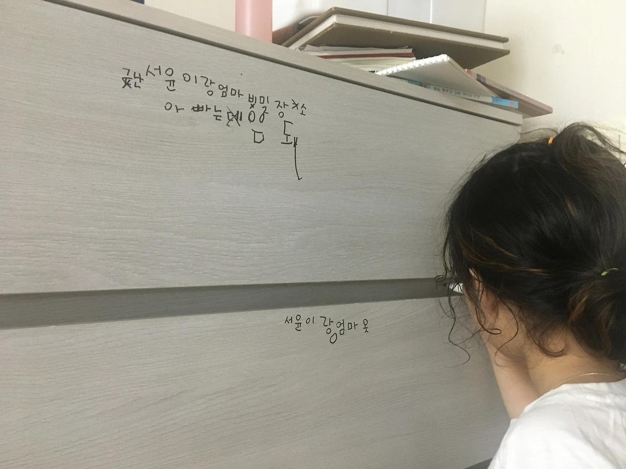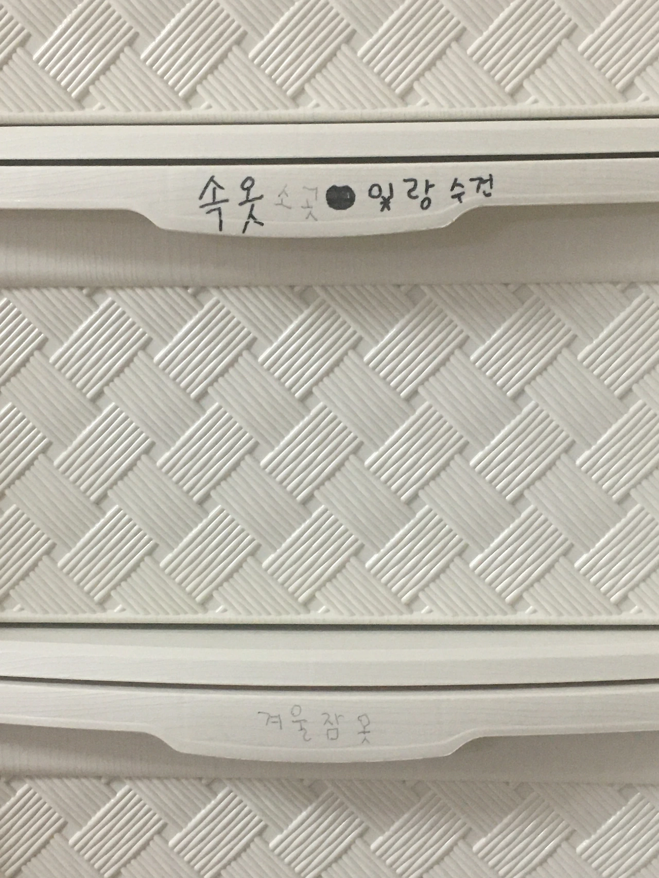 제일 윗 칸에는 '근난 서윤이랑 엄마 비밀장소 아빠는데(아빠는 열어봐도 괜찮다는 뜻)'라고 썼고, 두세 번째 칸은 '서윤이랑 엄마옷', 제일 아래 칸은 '겨울옷이랑 서윤이 수영복'이라고 써 놓았다. 한글을 제법 잘 읽지만 쓰기는 아직 서툴러서 그냥 소리 나는 대로 적다 보니 양말은 '얄말'로 속옷은 '소곳'이라 써서 나중에 고쳐 주었다.