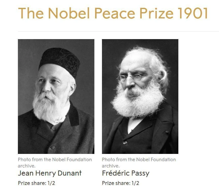 1901년 적십자 창립을 주도한 장 앙리 뒤낭이 프랑스의 경제학자이자 정치가인 프레데리크 파시와 함께 제1회 노벨평화상을 수상했다. 부상당한 병사들의 고통을 덜어주고 국제사회의 이해를 창출하는 데 기여한 공이 크다는 게 선정 이유였다.