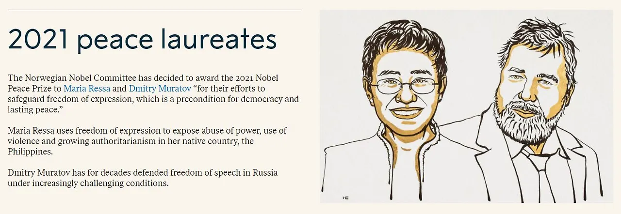 매년 10월이면 세계의 이목이 북유럽 스칸디나비아에 있는 스웨덴과 노르웨이에 쏠린다. 노벨상이 발표되기 때문이다. 지난 8일에는 노벨평화상 발표가 있었다. 권력에 맞서 표현의 자유를 지켜낸 두 언론인 마리아 레사(필리핀), 드미트리 무라토프(러시아)에게 올해의 상이 돌아갔다.