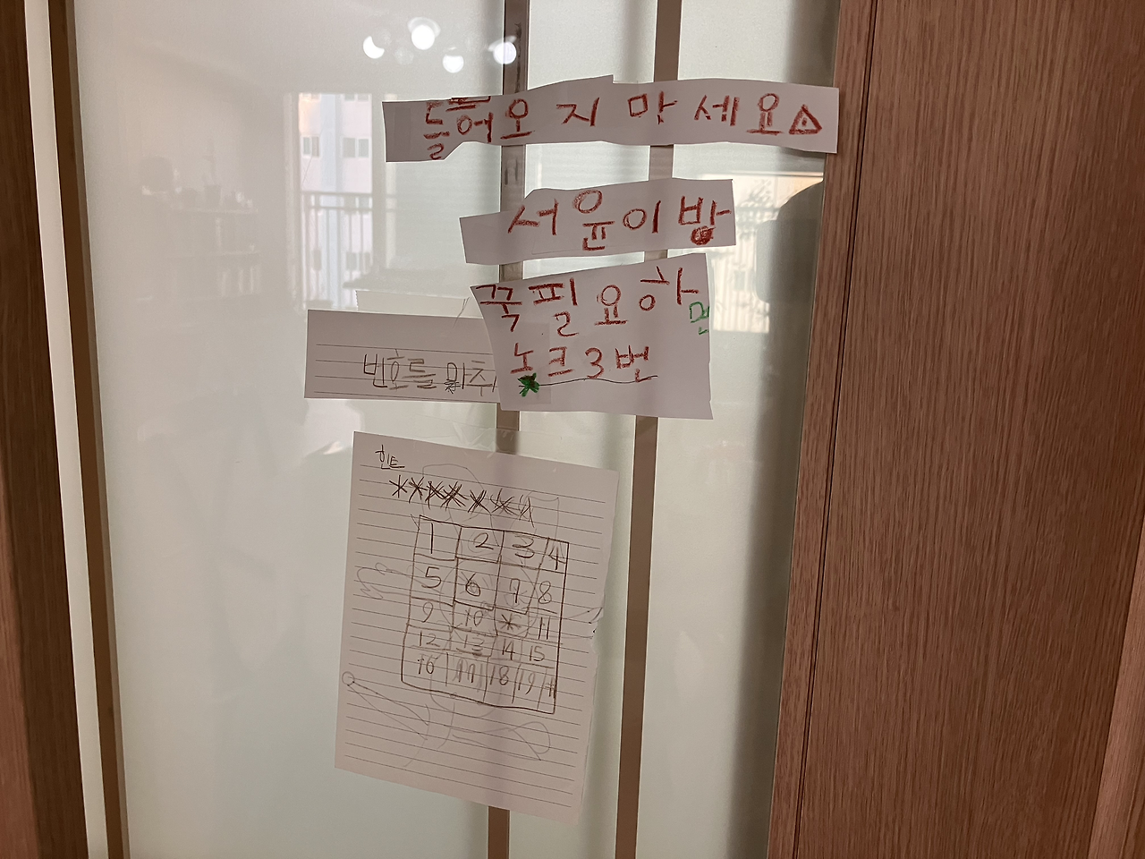 소파 옆에서 발견된 뒤집힌 양말 두 짝의 주인은 당연 딸아이다. 들으라고 큰 소리로 말했건만 듣는 척도 안 하고 있어서 양말 두 짝을 들고 아이를 장난스럽게 뒤쫓아 갔다. 아이가 자기 방으로 들어가길래 나도 같이 따라 들어갔더니 아이가 갑자기 "아빠. 내 방에 들어올 때는 비밀번호를 누르고 들어오셔야죠."라며 역공을 핀다.