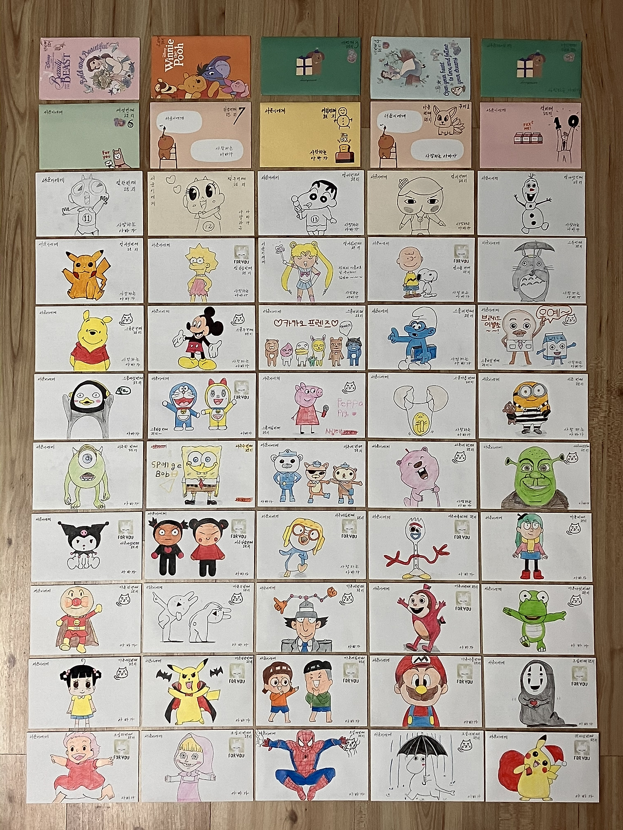 유튜브가 좋은 스승이 되었다. 유튜브에는 만화 캐릭터를 그리는 과정을 보여주는 영상이 많다. 내 목표는 그 영상을 보고 편지지에 따라 그리기였다. 응용이 어디 가당키나 하던가. 그렇게 매주 내게 맞는 영상을 찾고, 아이가 알만한 만화 캐릭터를 바꿔 가면서 하얀 편지지 위에 그렸다.