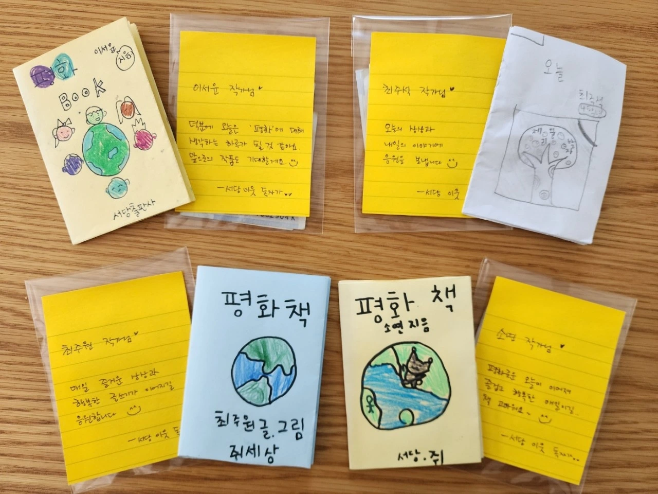 얼마 전 문학수업에서 작은 책 만들기를 하였나 보다. 선생님께서 평화라는 주제를 주셨고, 아이들은 각자 A4 용지를 손바닥 만하게 여러 번 접어서 그 안에 글도 쓰고 그림도 그렸다. 그리고 선생님과 약속해서 희망하는 사람에 한하여 만든 책을 서점에 진열하고 2천 원에 팔기로 했단다.
