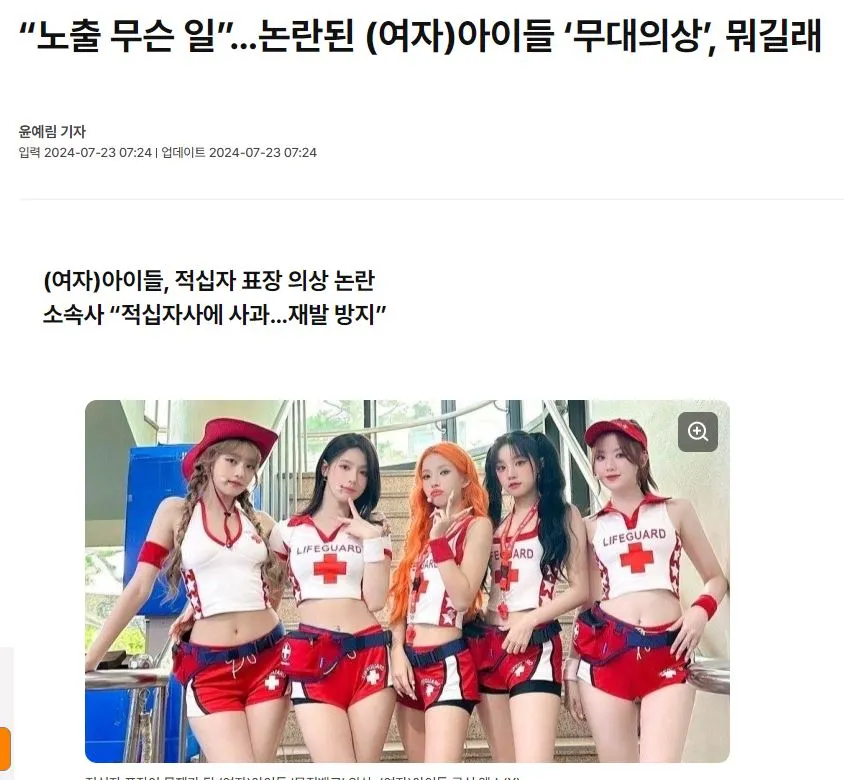 오늘 적십자 표장과 관련된 기사가 많이 났다. '퀸카', '나는 아픈 건 딱 질색이니까'를 부른 인기 걸그룹 여자 아이들이 신곡 무대에서 라이프 가드(Life Guard)와 적십자가 그려진 의상을 입었는데 적십자 표장 규정을 위반하였다는 내용이었다. 대한적십자사 조직법 25조에는 적십자사, 군 의료기관 또는 적십자사로부터 그 사용승인을 받은 자가 아닌 자는 사업용이나 선전용으로 흰색 바탕에 붉은 희랍식 십자를 표시한 적십자 표장 또는 이와 유사한 표장을 사용하여서는 아니 되며, 이를 어길 시에는 1천만 원 이하의 벌금에 처해진다고 명시되어 있다. 회사 측도 문제를 인지했다 하니, 무대의상은 바로 바뀌겠지. 암튼 적십자 표장은 이뻐 보여도 함부로 쓰면 안 된다.