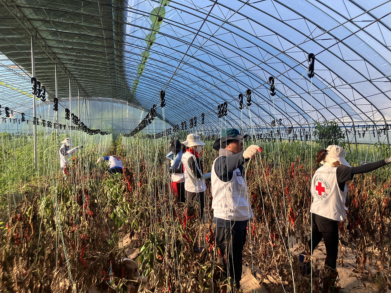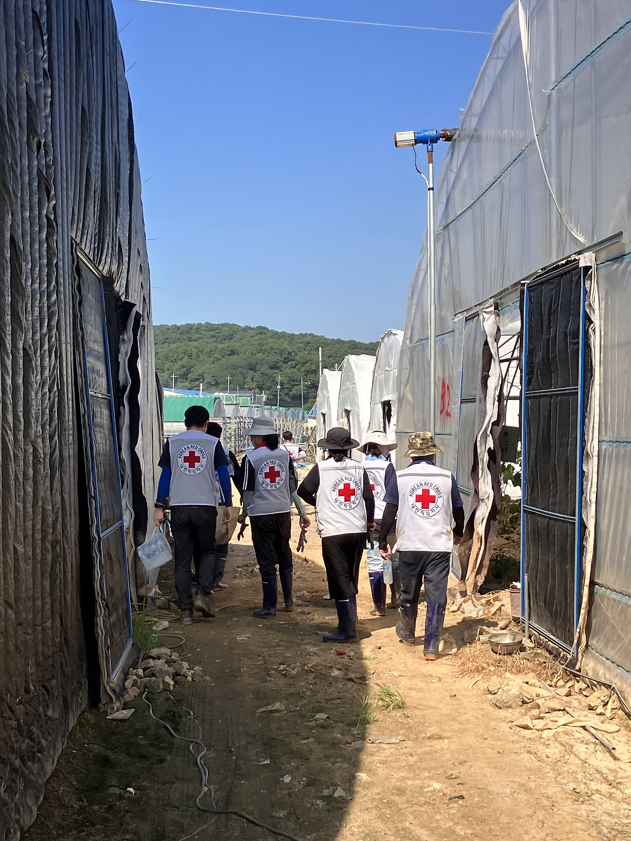 오전 7시가 안 되어 버섯농원에 도착했다. 주변이 다 잠겼을 텐데 언제 그랬냐는 듯 산천은 바짝 말라 보였다. 우리 지사와 혈액원에서 직원 17명, 충남지사 적십자 봉사원들이 10여 명 나오셨다. 할 일은 물에 잠겼던 하우스 안 농작물을 제거하는 일. 현장에서 주의사항을 듣고 작업할 하우스로 이동했다. 외부 온도도 뜨거운데 하우스 안은 더 더워서 자칫 온열질환이 발생할 수 있기 때문에 오전 11시까지 마무리해야 한다고 안내받았다.