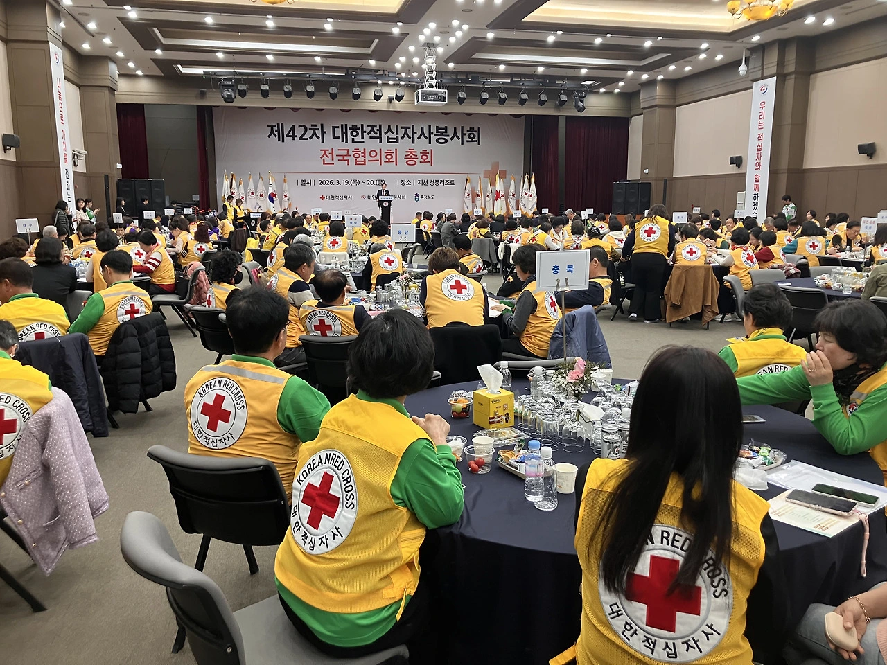 19일날 밤, 봉사회 전국 총회 만찬 건배사에서 '따봉'이 등장했다. 10만 노란 조끼 적십자 봉사원을 대표해 전국의 봉사회 임원 300여 명이 한 자리에 모였다. 식순대로 건배사가 이어졌다. 이 자리에서 한 봉사회장님이 본인 차례에서 이날 행사의 의미를 전하며 "건배사를 따봉으로 하겠습니다."라고 말하셨다. 봉사하는 분들이 최고라는 의미겠지 했는데, 따봉의 의미는 살짝 달랐다. 이날 따봉은 "따지지 말고 봉사하자."의 줄임표현. 논리 보다는 실천. 봉사원님의 번뜩이는 건배사 센스에 또 한 번 웃고, 서로 따봉을 외치며 잔을 부딪쳤다.