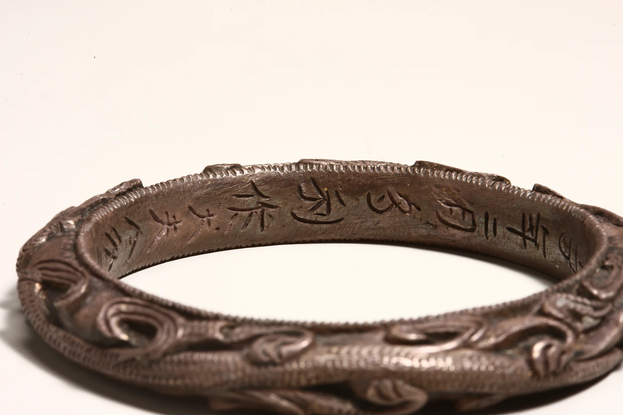 팔목이 닿는 안쪽에는 톱니 모양을 촘촘히 새겼고, 바깥 면에는 발이 셋 달린 용 두 마리를 새겼다. 팔찌 안 쪽의 명문에 의하면, "경자년(520년) 2월에 다리가 왕비를 위해 만들었다."라고 되어 있어, 왕비가 죽기 여러 해 전에 만들어진 것으로 보인다. 만든 사람의 이름과 무게 등이 기록되어 있어 가치가 높다.