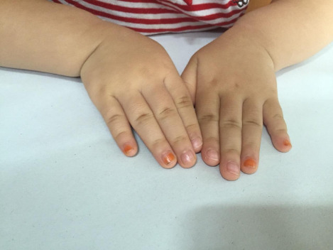 낮시간 서윤이를 봐주시는 선생님께서 서윤이 양쪽 약지와 새끼손가락에 이쁘게 봉숭아 물을 들여주셨다.