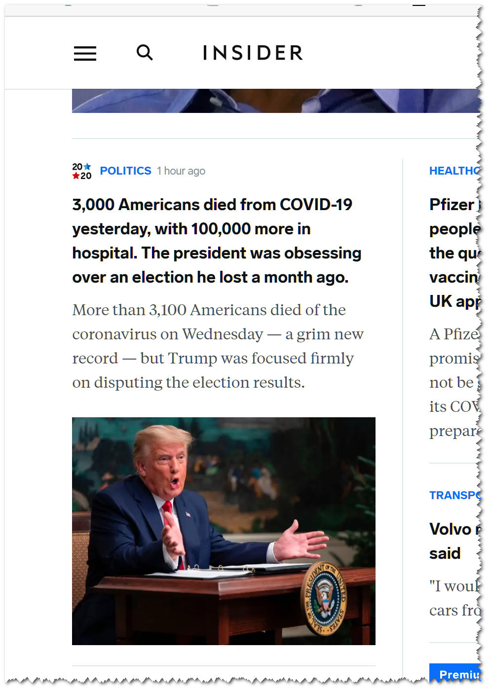 트럼프는 선거에 지고도 백악관을 나오지 않으려 하고 있다. 선거가 부정이다라면서 50 여건의 불복 소송 폭탄을 날렸고, 어제는 개인적 주장을 담은 동영상을 백악관에서 찍어 SNS에 유포했다. 게다가 이 영상을 “재임 기간 중 가장 중요한 발표”라고 까지 했는데, 도대체 지난 4년 간 수많은 국제 관계의 발표와 선언 들이 이 보다 중요도가 떨어질까? 결국 이기적인 리더의 최우선 과제는 자기이기 때문이다 리더니 기술자니 구분도 극도의 코미디 잎에는 그게 그거라는 반증의 하나다.
