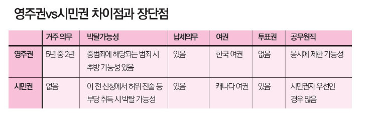 영주권은 시민권과 달리 국적 포기가 아니다. 국적포기로 오는 외국인 신분의 불편함을 없애고, 양쪽 나라에서 자유롭게 거주하고 살 수 있는 자격을 유지하는 것이다. 영주권 취득은 한국 국적은 유지하면서 해당국에서 영구적으로 살 수 있는 권리를 가진다는 의미다. 그러나, 시민권은 말 그대로 해당 국가의 시민이라는 뜻으로 취득하면 그 나라 국적자가 된다. 이중 국적을 허용하지 않는 캐나다는 시민권을 취득함과 동시에 한국 국적을 상실한다. 시민권 취득 후에는, 캐나다 국적자로서 더 이상 한국법의 적용을 받지 않으며 캐나다법을 준수해야 하지만, 차후에 캐나다 시민권을 포기한다면 다시 한국 국적을 회복할 수도 있기는 하다.