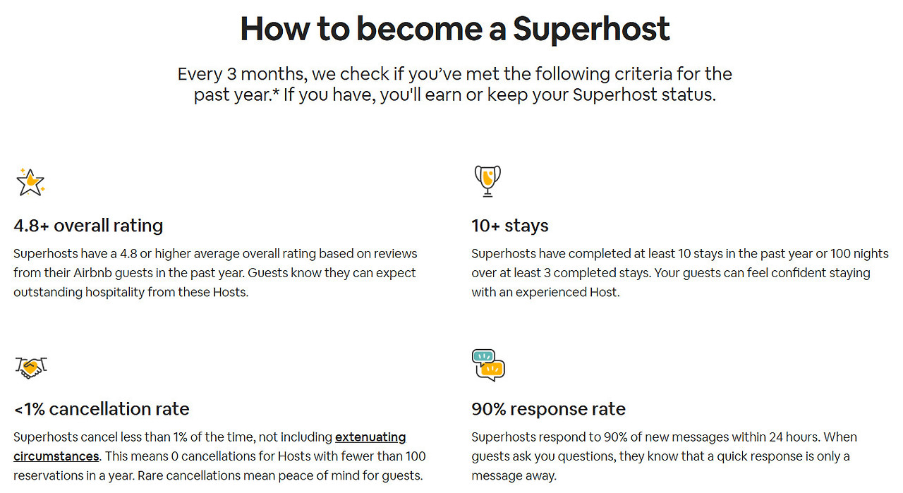 에어비앤비는 분기마다 슈퍼호스트 여부를 결정하는데, 네 가지 기준을 적용한다.