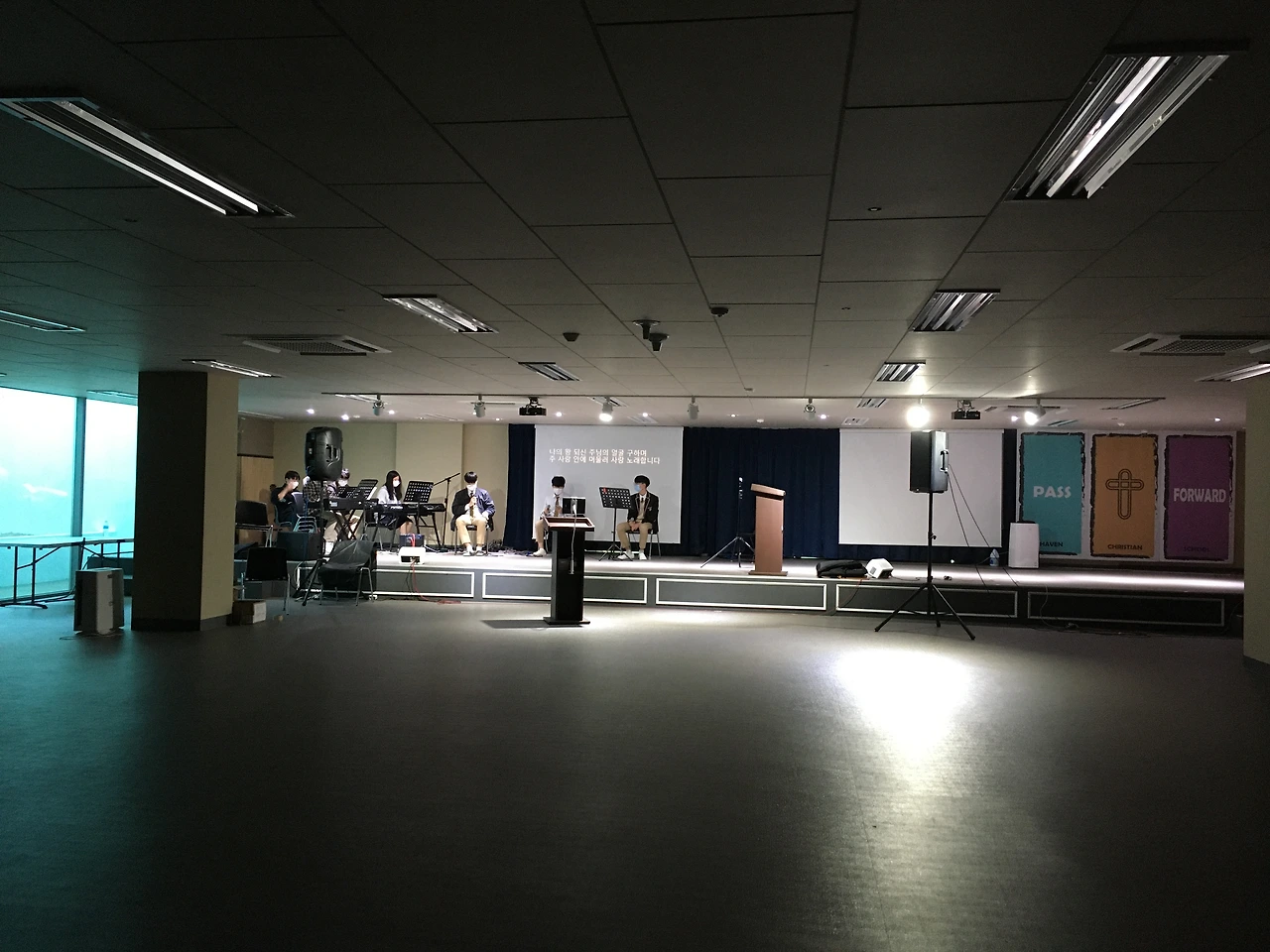 매 주, 교회 사무실 창고에 옮겨 놓았던 음향 기기를 끌고 들고 밀고, 그렇게 예배를 드리는 회의실 까지 옮겼는데 (정말 힘들었단다.. 토요일 마다 그 많은 음향 기기들을 옮겨서 셋팅하고, 주일 예배 후 다시 정리해서 창고에 옮겨 놓고.. 그야말로 토요일 주일은 음향 장비 이동과 설치로 가득 채워져 있었지).