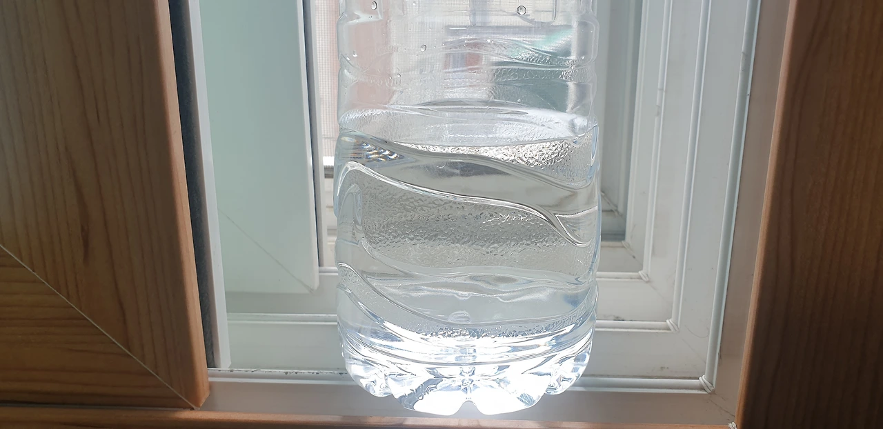 생수병에는 이렇듯 물이 고즈넉하게 담겨있고, 그 안이 훤히 보인다.