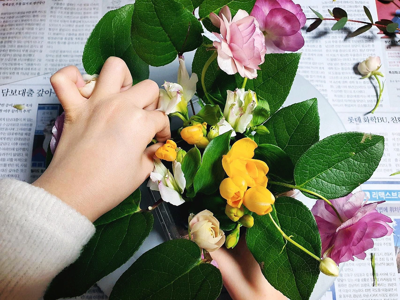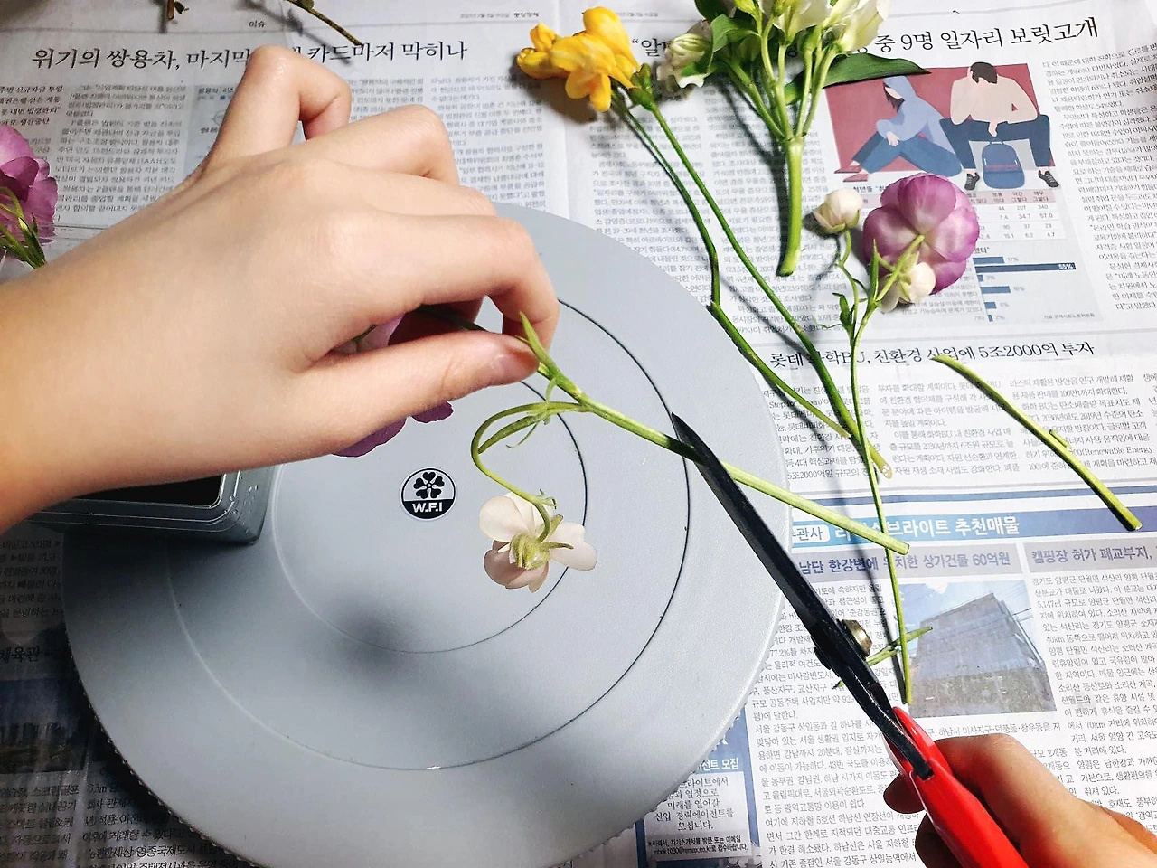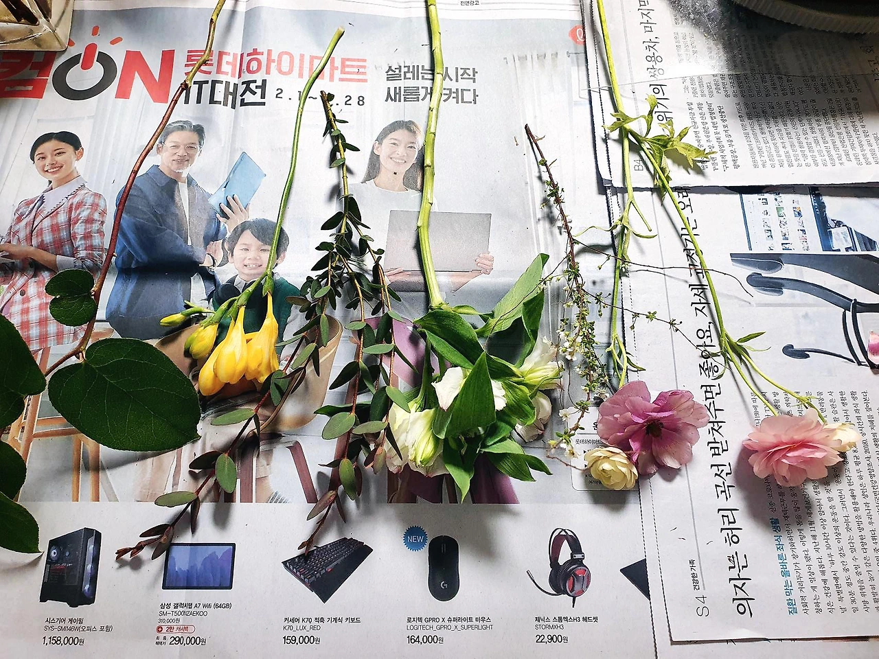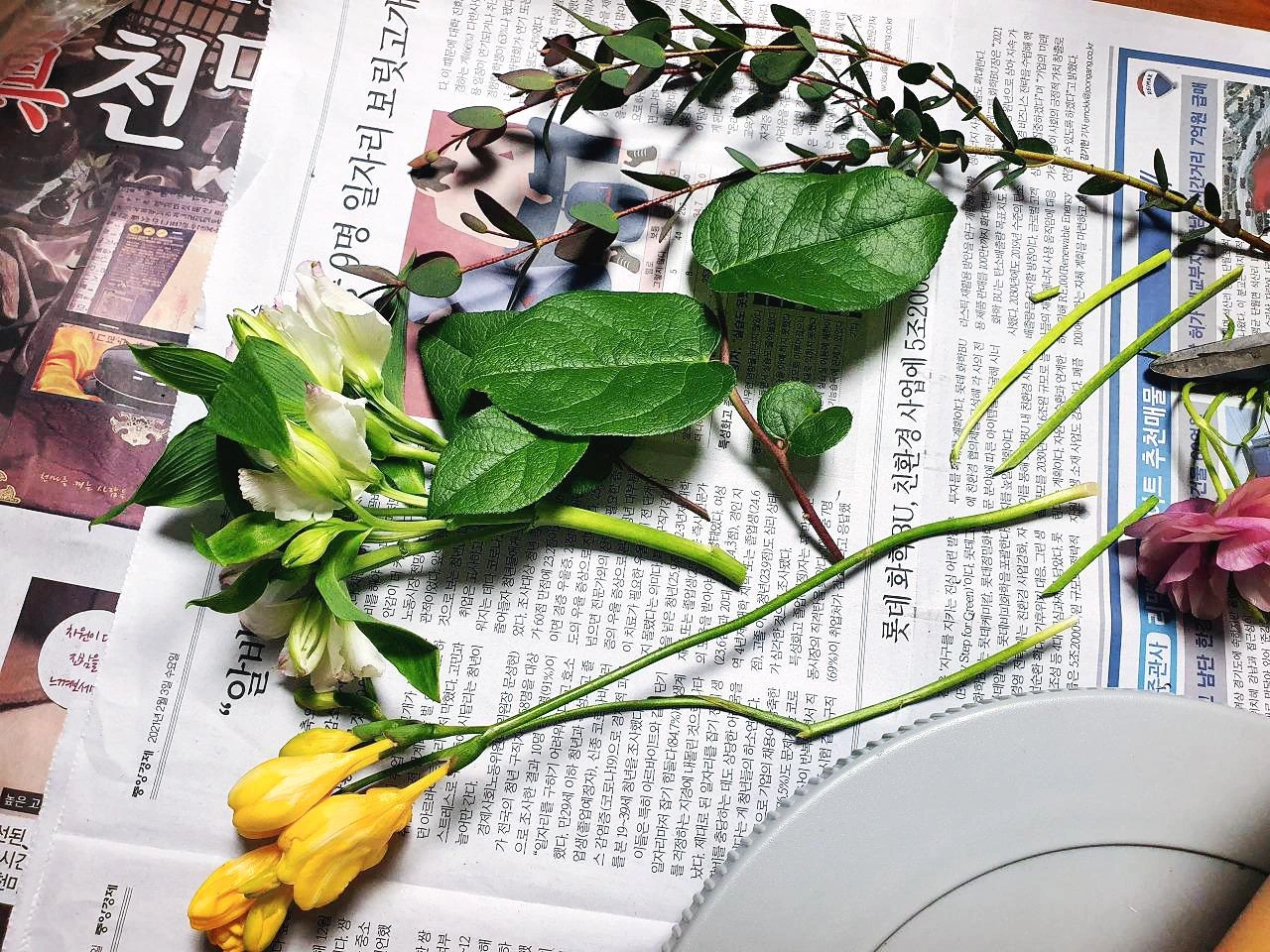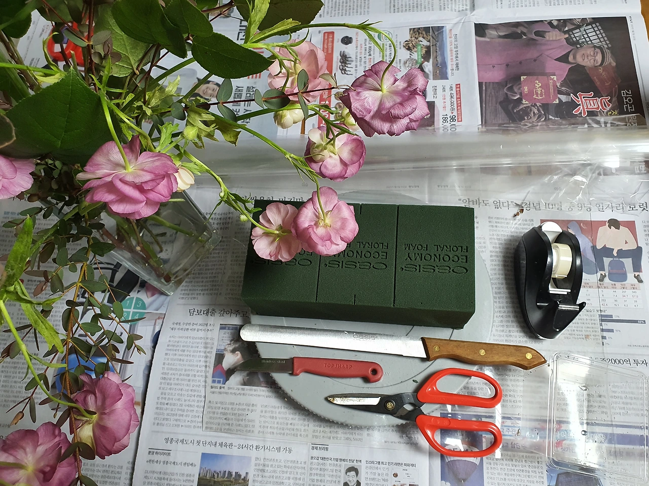 ****물을 먹은 꽃 가지에서 물이 나오니 신문지를 두껍게 깔거나 아스테이지 같은 비닐을 깔아주면 작업을 마치고 청소하기가 한결 수월합니다.