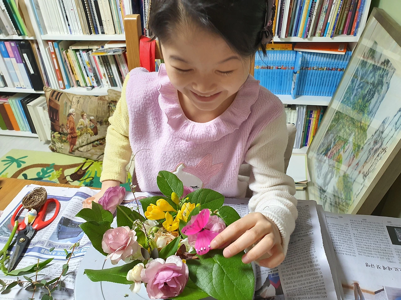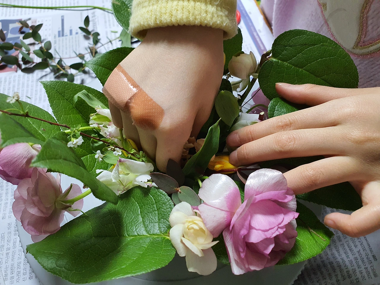 같은 재료라도 완성작을 보면 그 사람만의 느낌이 있기 마련입니다. 아이의 꽃꽂이를 보고 있노라니 행복이 묻어나는 것 같습니다.