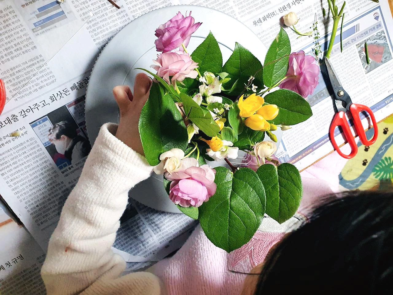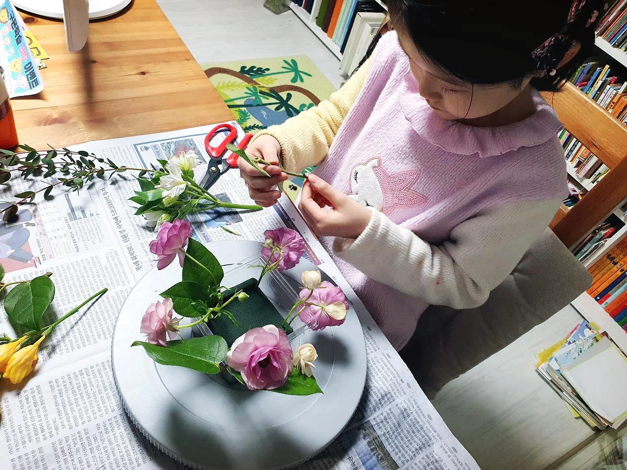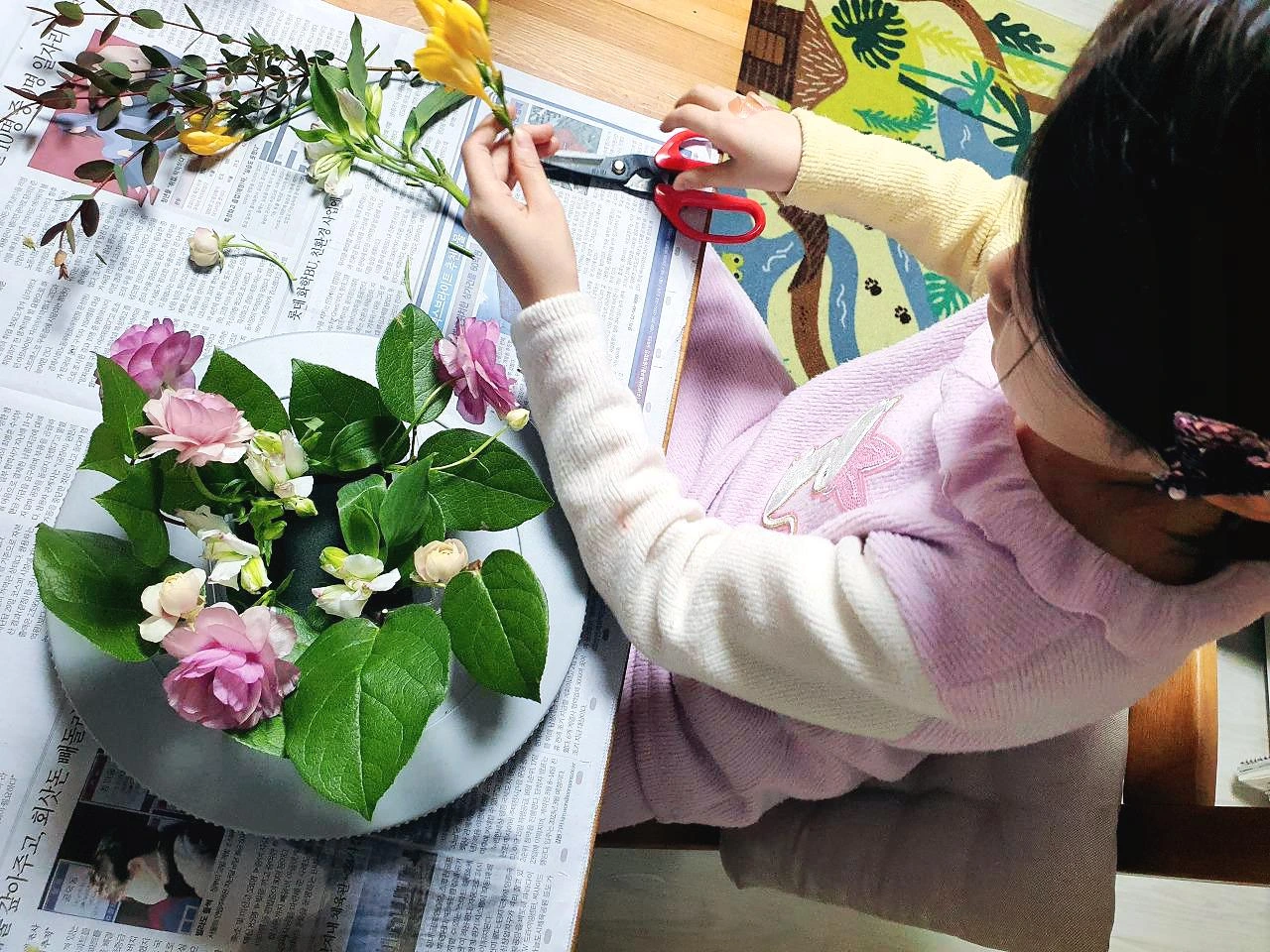 가위로 자르고 꽃을 조화롭게 꽂는 일이 생각보다는 쉽지 않은데 아이는 차분하게 그리고 거침없이 꽂아 갑니다.