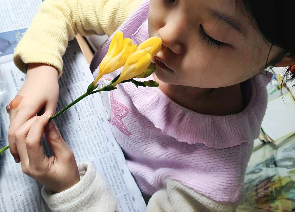 아이의 이런 반응을 볼 때면 꽃은 오감을 만족시키는 소재임에는 정말 틀림이 없는 것 같습니다. 예쁜 화형과 색감은 시각으로, 향기는 후각으로, 생명력있는 탄탄한 줄기와 꽃잎은 손끝으로 느끼는 촉각까지 말입니다.
