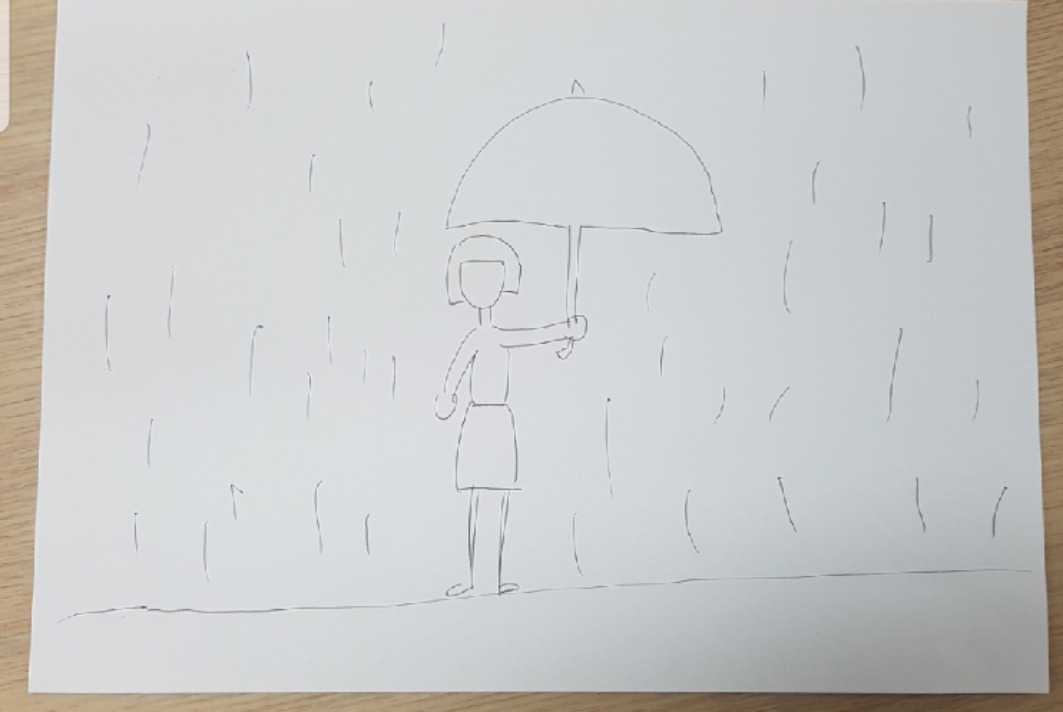 비 그림을 보며, 폭우가 쏟아지고 바람이 불고 있는 것으로 보아 스트레스가 크고 그것이 주변 요인에 있음을 나타낼 수 있다고 했다. 또한 우산을 중간에 그림으로서 나의 의존적인 성향이 드러나며 어찌할 바를 모르고 꼼짝 못 하고 있는 상황이 지금 현재의 상황을 대변하는 게 아닌가 말씀하셨다. 그럼에도 불구하고 고무적인 것은 우산의 크기라고 강조하셨다. 우산이 굉장히 큰 것은 이를 이겨낼 힘을 스스로 가지고 있다며, 나를 격려해주셨다.